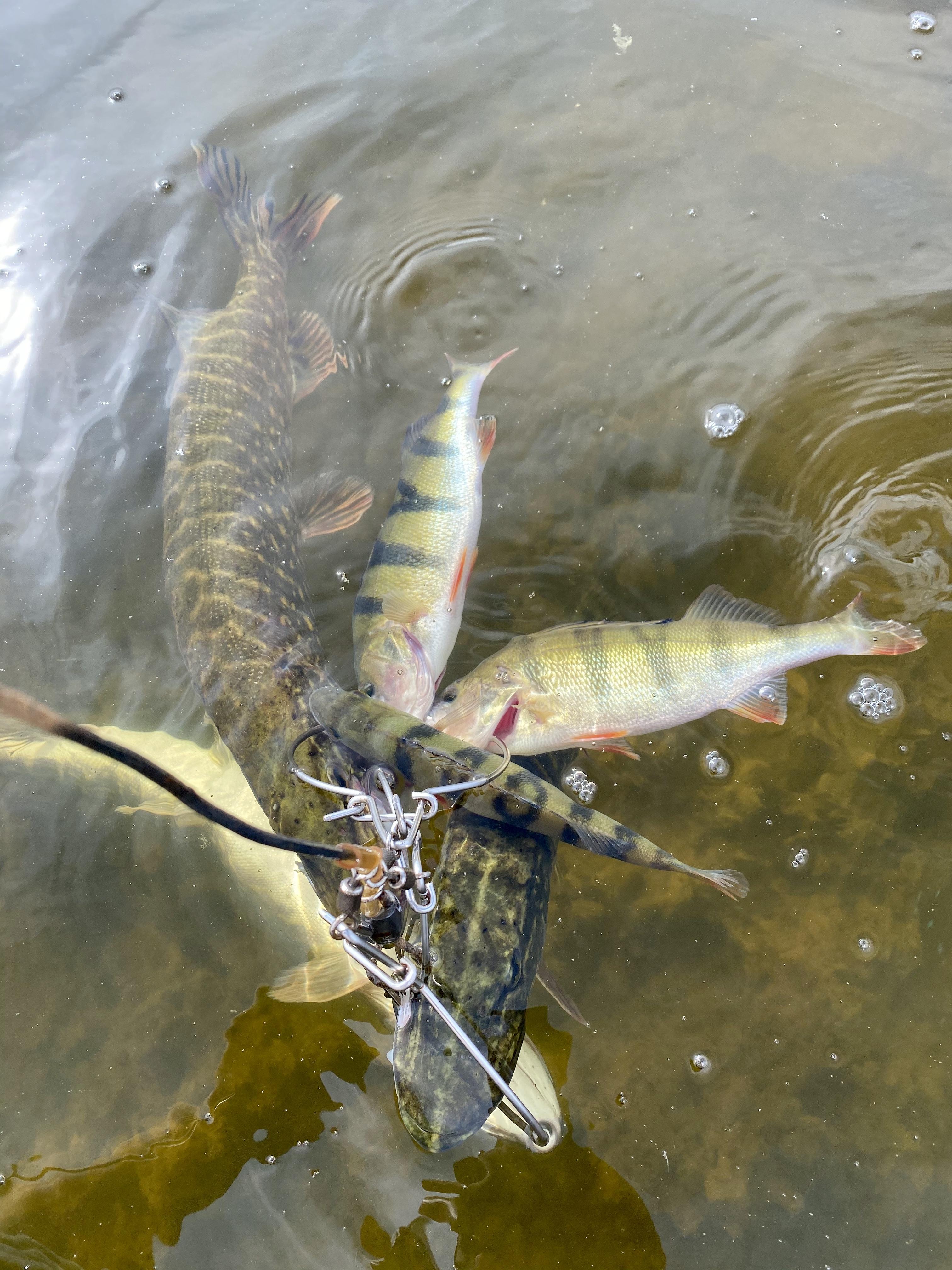 Рыба как будто сама смещается и гуляет, потому что кинул 30 раз в одно место—нет ничего, Потом в это же самое место — и 2 — 3 окуня и пару щук, потом опять тишина.Изначально пару штук было по килограмму, а потом Основная рыба за 2 кг.
