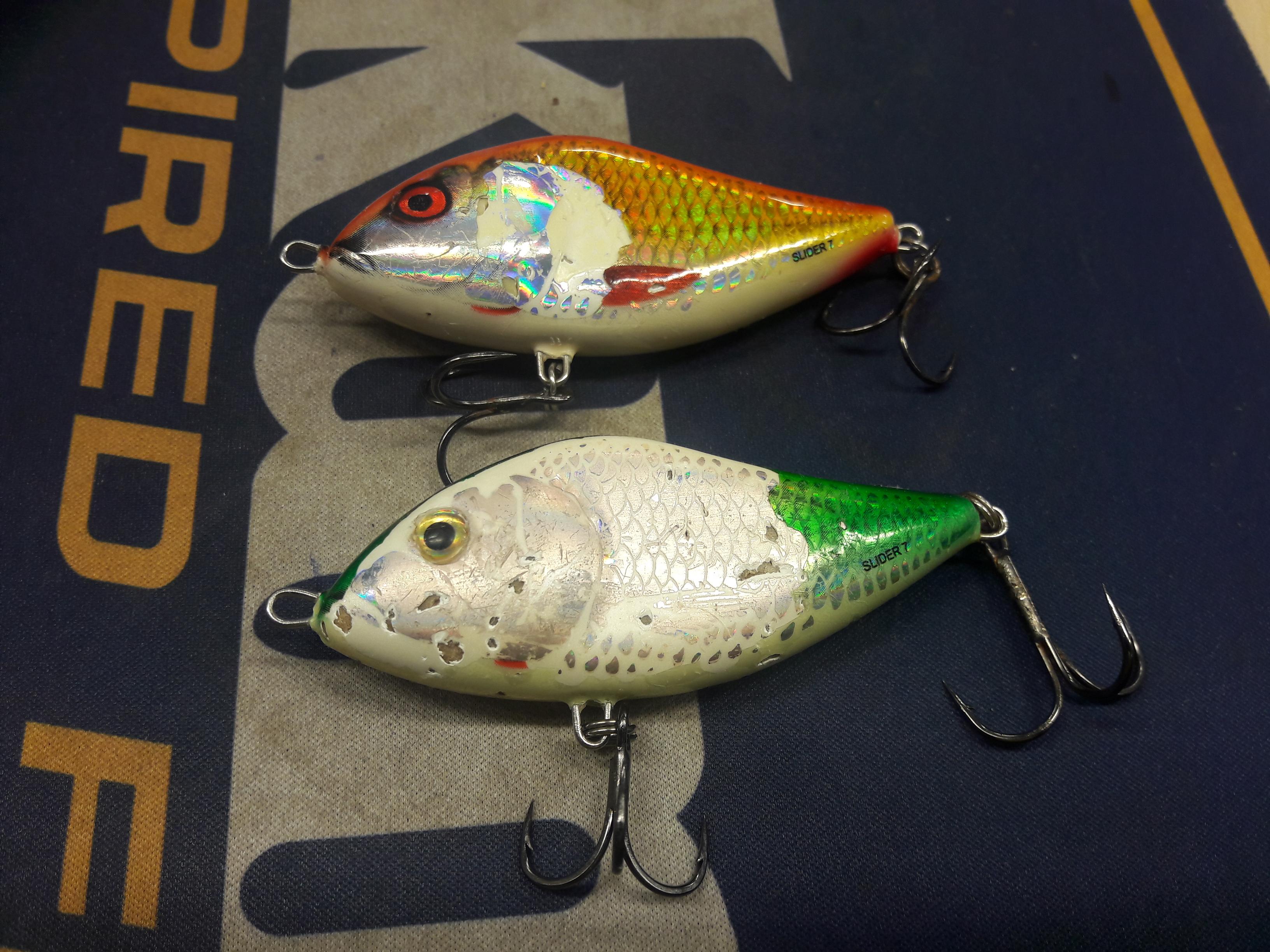 Ловил на слайдеры. Причём «Хрюшу» ( на верхнем снимке ) только позавчера приобрёл, а нижний отработал лишь 3 рыбалки — всё в хлам и клочья.