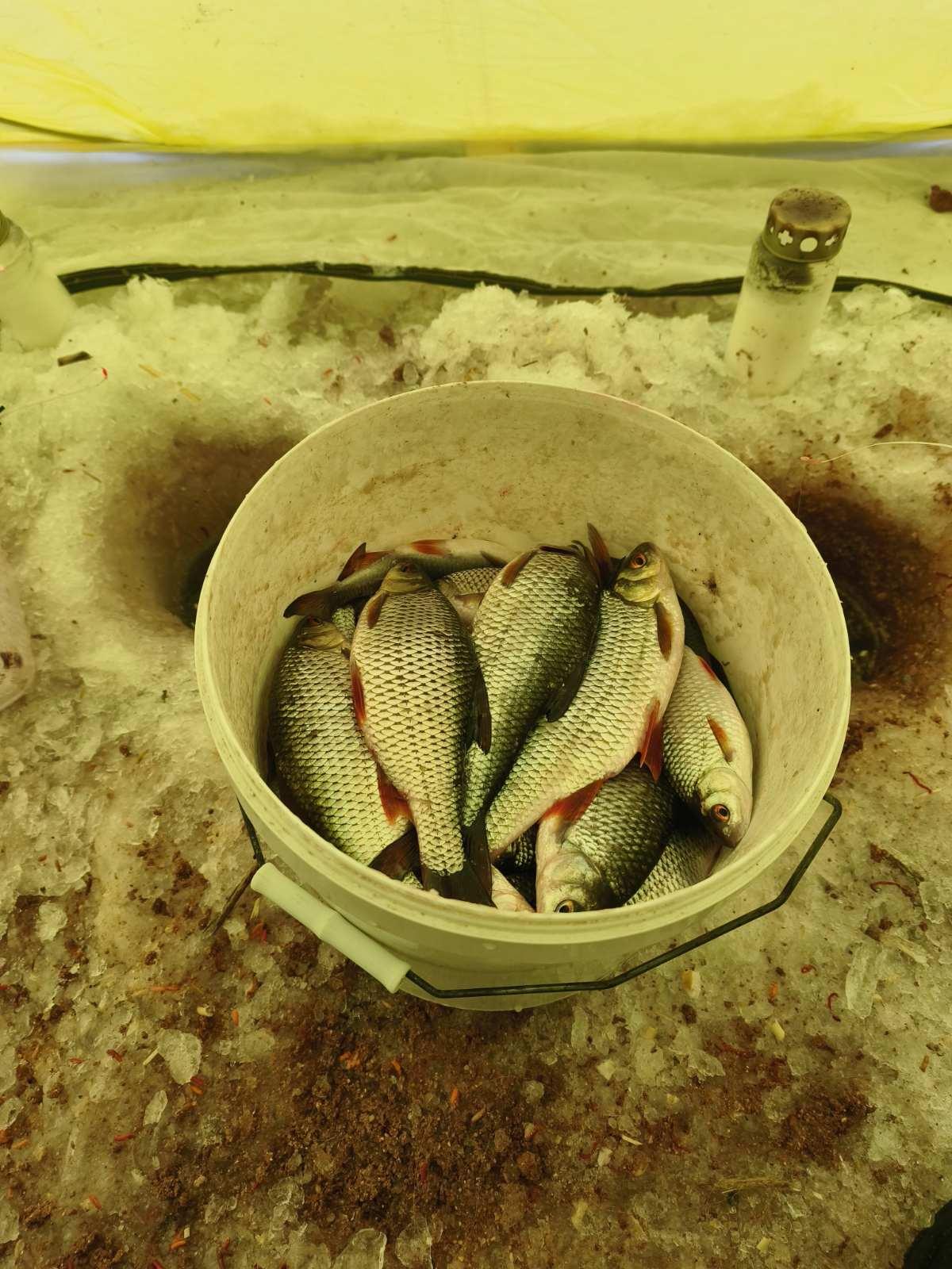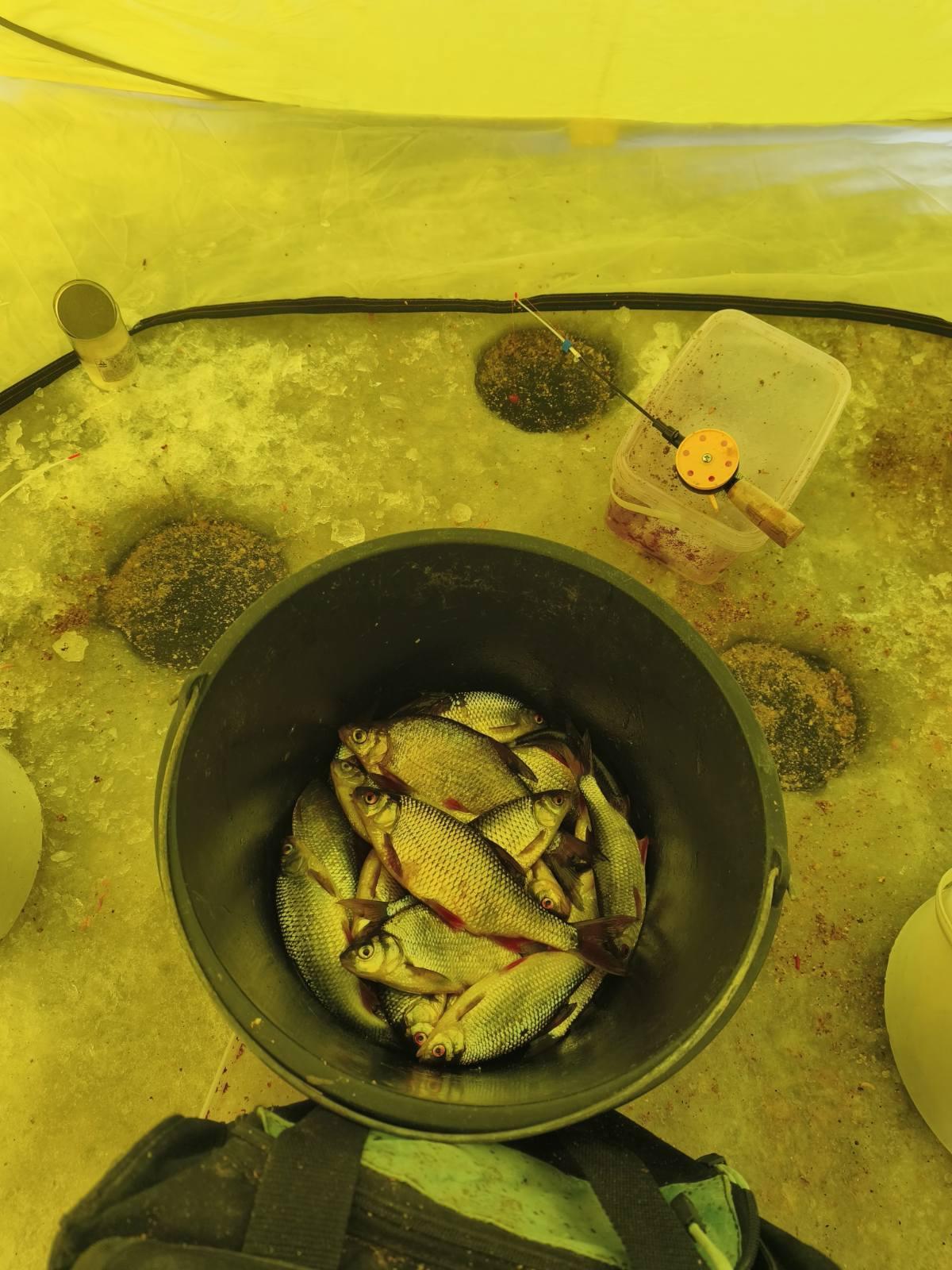 Может из-за морозов, может ещё по какой причине ( в принципе, довольно поздно начал ), но в крайний раз рыбалка у Дальнозоркого оказалась скромнее предыдущей. Ловил с 9 до 13. Результат вот такой ( на фото не очень понятно. Это 2/3 большого ведра. Считаю, что вполне неплохо. )