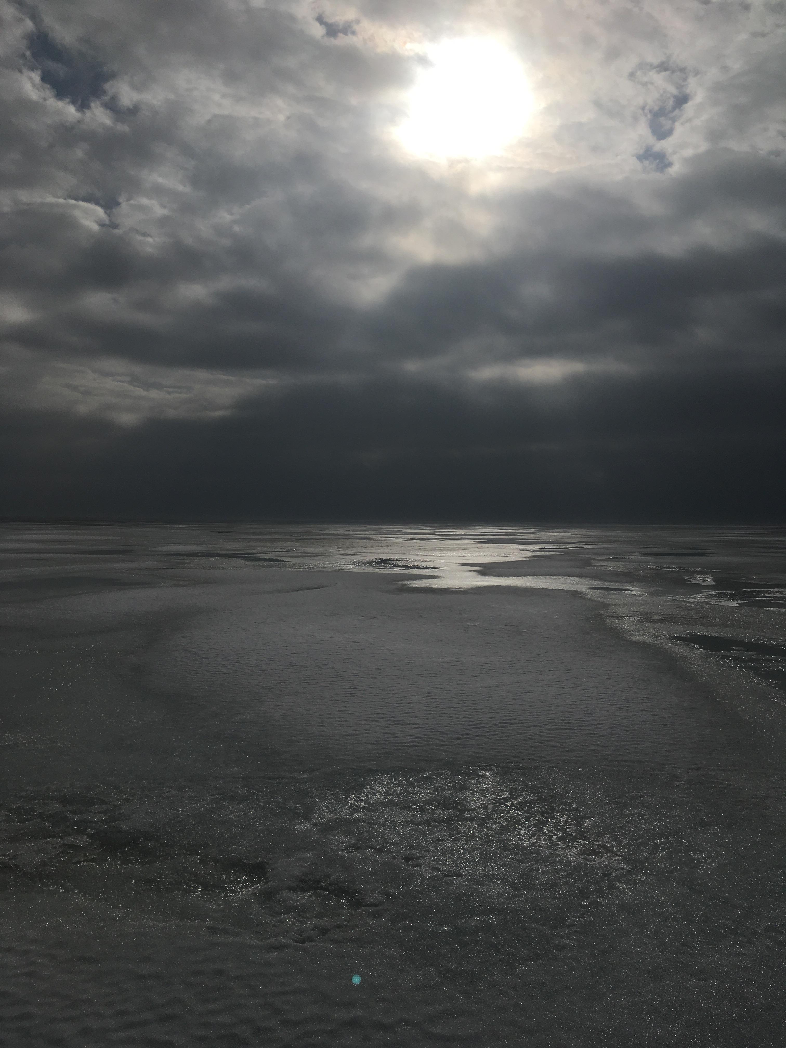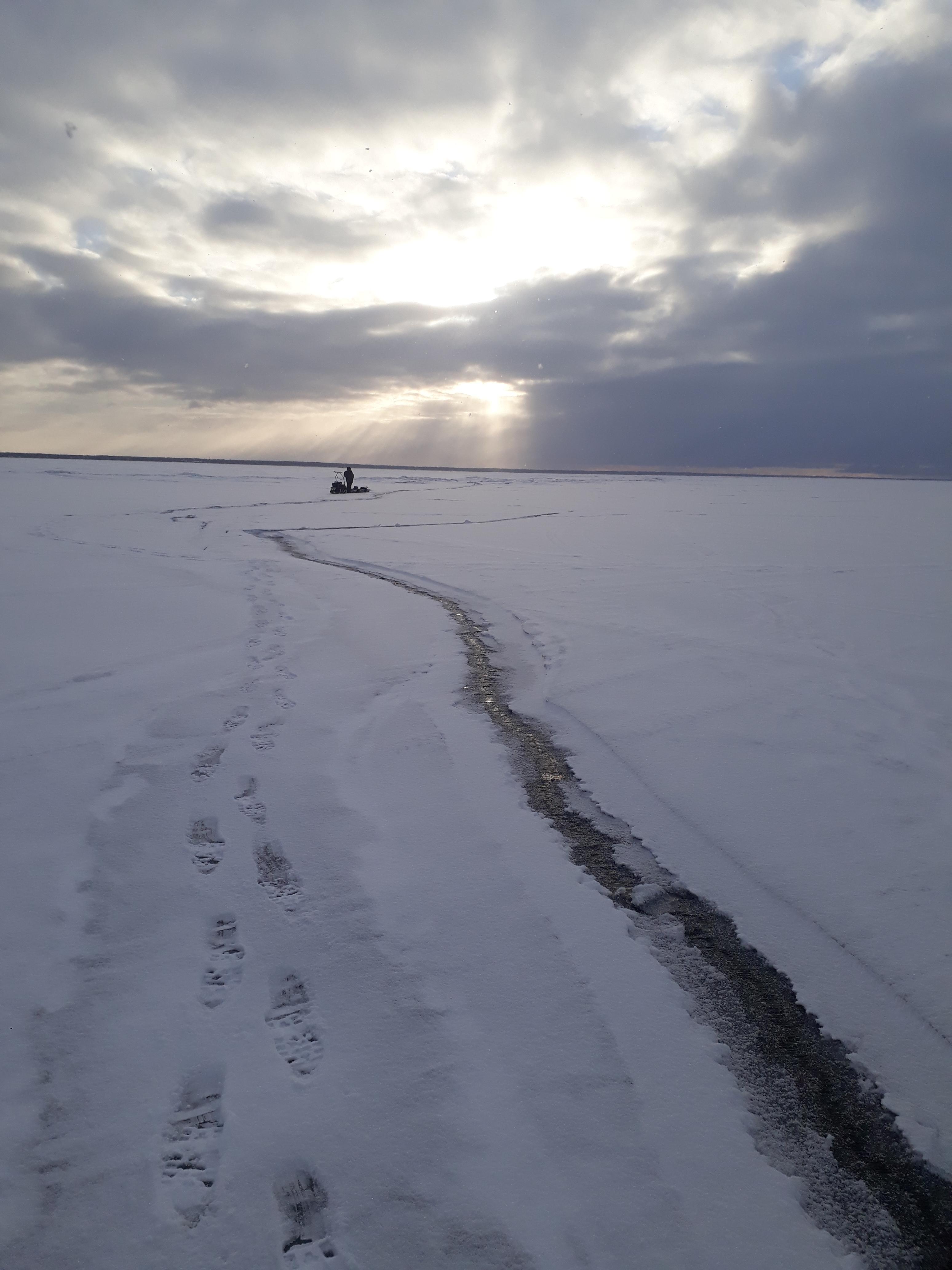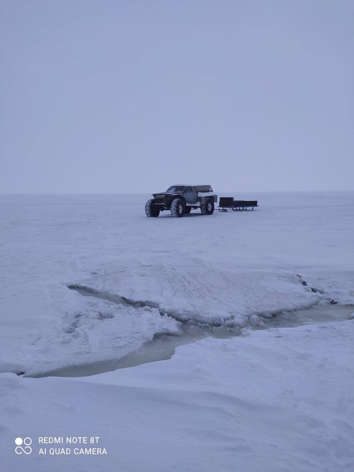 Погода отвратительнейшая. Жуткий ветрище, я такого и не припомню. В два сидели в машине и грелись, так как задубели насквозь. Ветер пронизывал до костей и даже глубже. Не помогали ни суперкостюмы, ни термобельё.Лёд больше тридцатки. У берега перепрыгнули трещину, сантимов 40. Но когда шли назад , трещину у берега раздвинуло ещё см на 30-40, но не криминально, обошли.