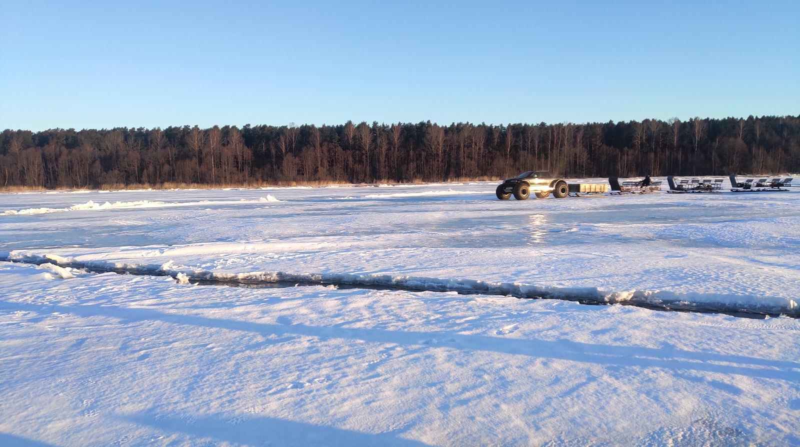 Озеро замерзшее, воды на льду нет. Ход отличный (на собаке), правда, трясет, как на стиральной доске. 😁