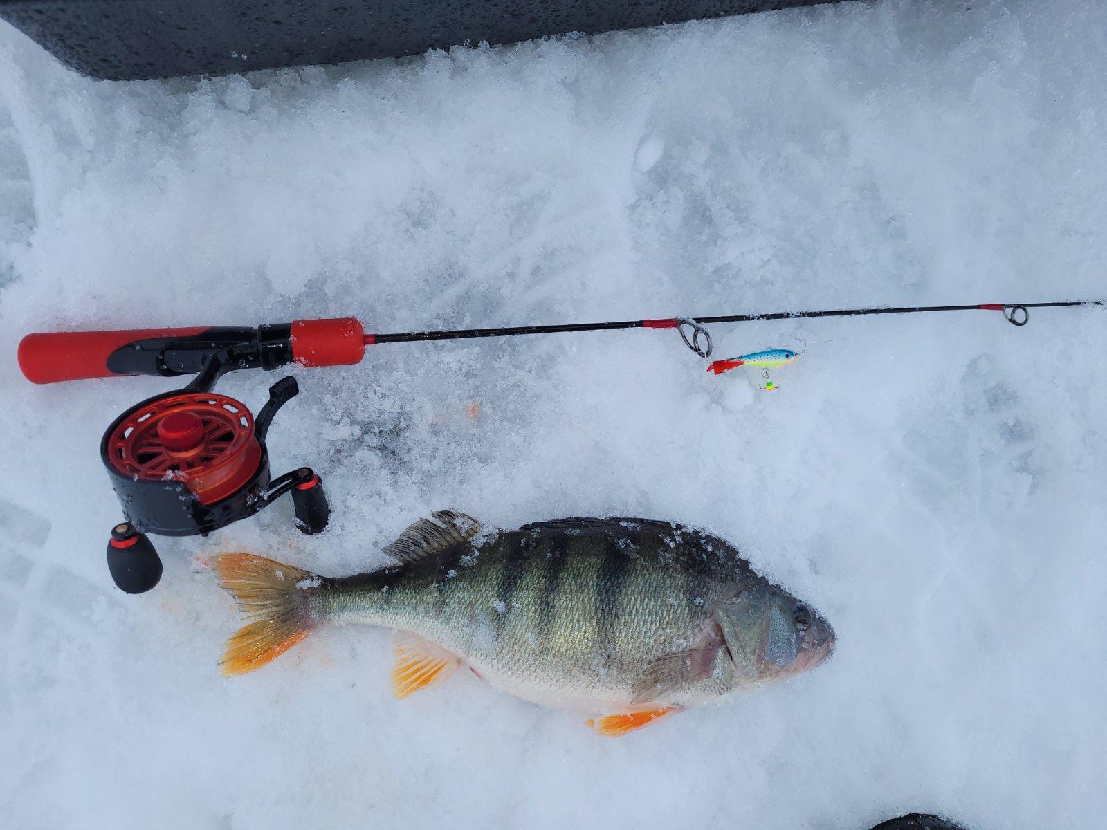 Сегодня сразу на ту поляну, на ту же лунку. И клев начался сразу же. Решил с приманкой не мельчить- повесил «тргр шпалу»-17 г, окуня одобрили. Пробовал и другие железки, но с этой все происходило быстрее. Так как в ночь на работу, решили уехать в 13-30. К этому времени +- около нормы было поймано. Самый- 500г, в этом сезоне рекорд.