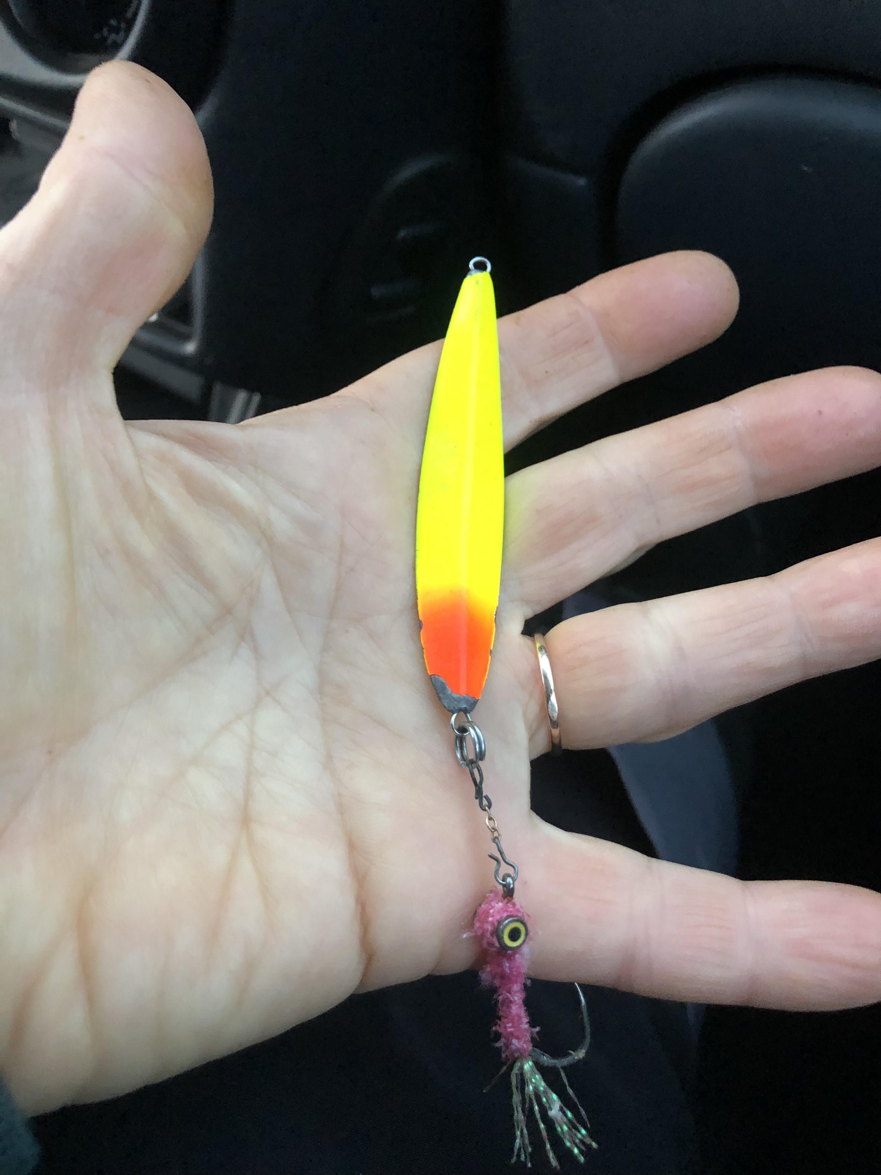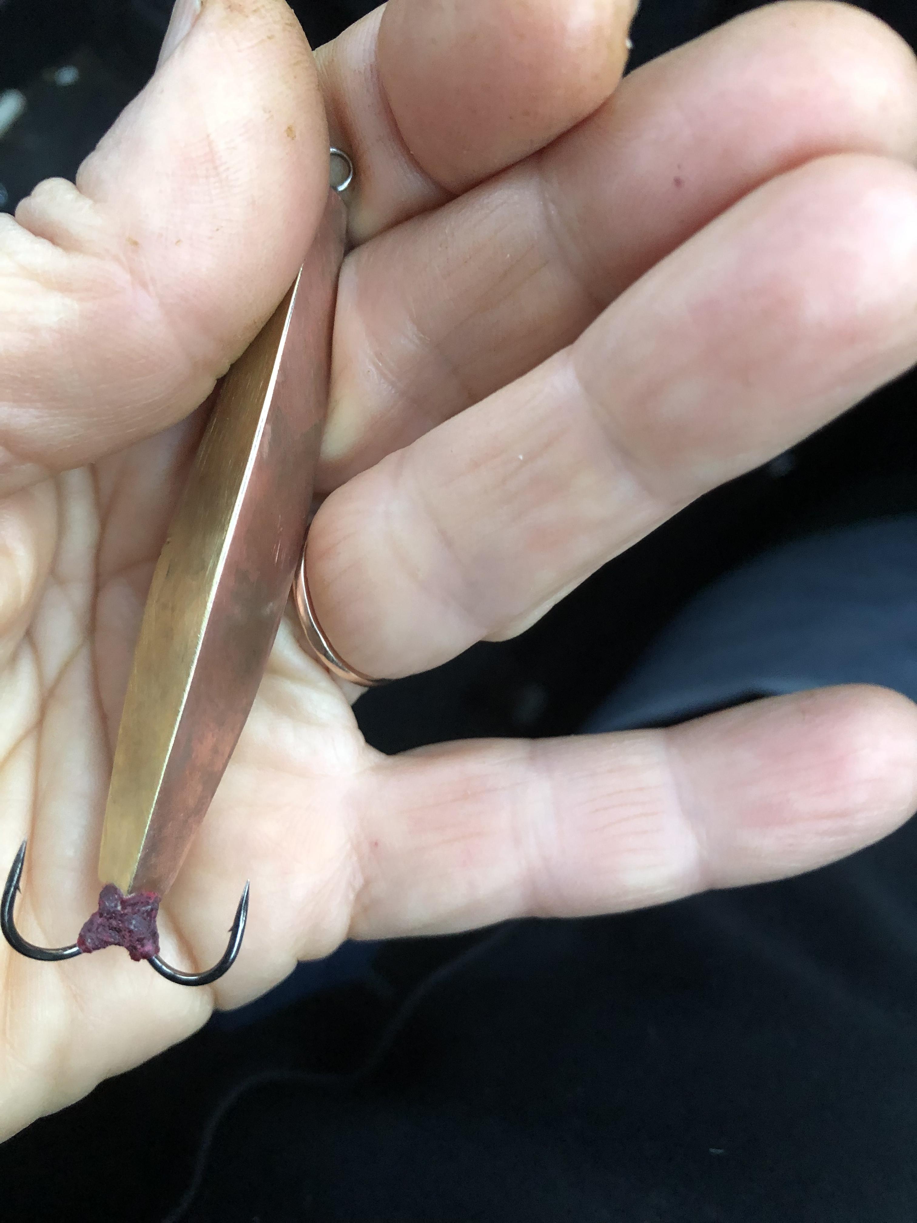 День провёл, как часто у меня бывает, в тестировании разных блёсен. Все мои работали, но в каждой лунке «Полуромб 47», масса 7 гр (бронза и серебро)- настоящий убийца окуня. Если кому-то надо, то могу описать технологию изготовления и коронку отшлёпать.