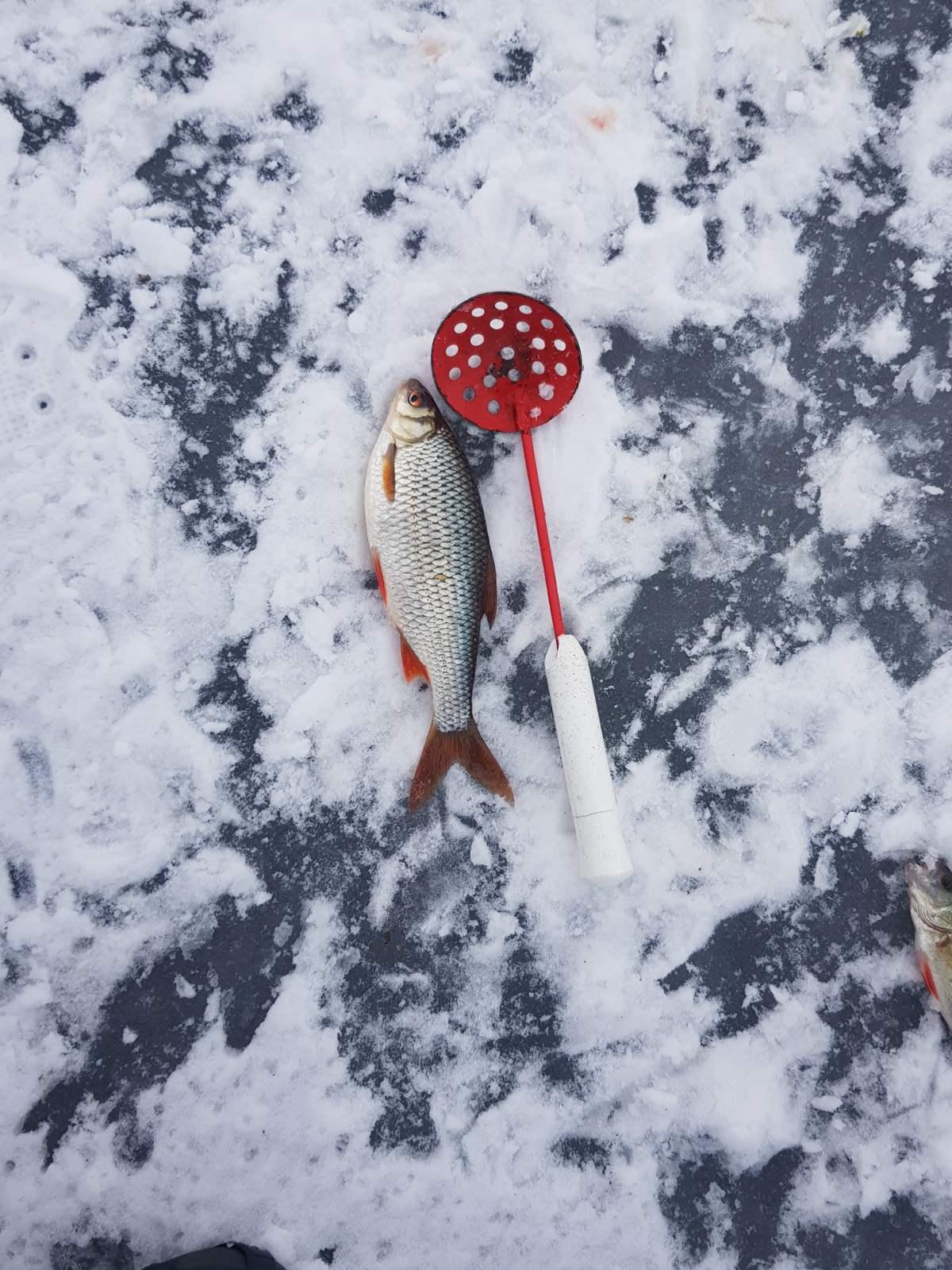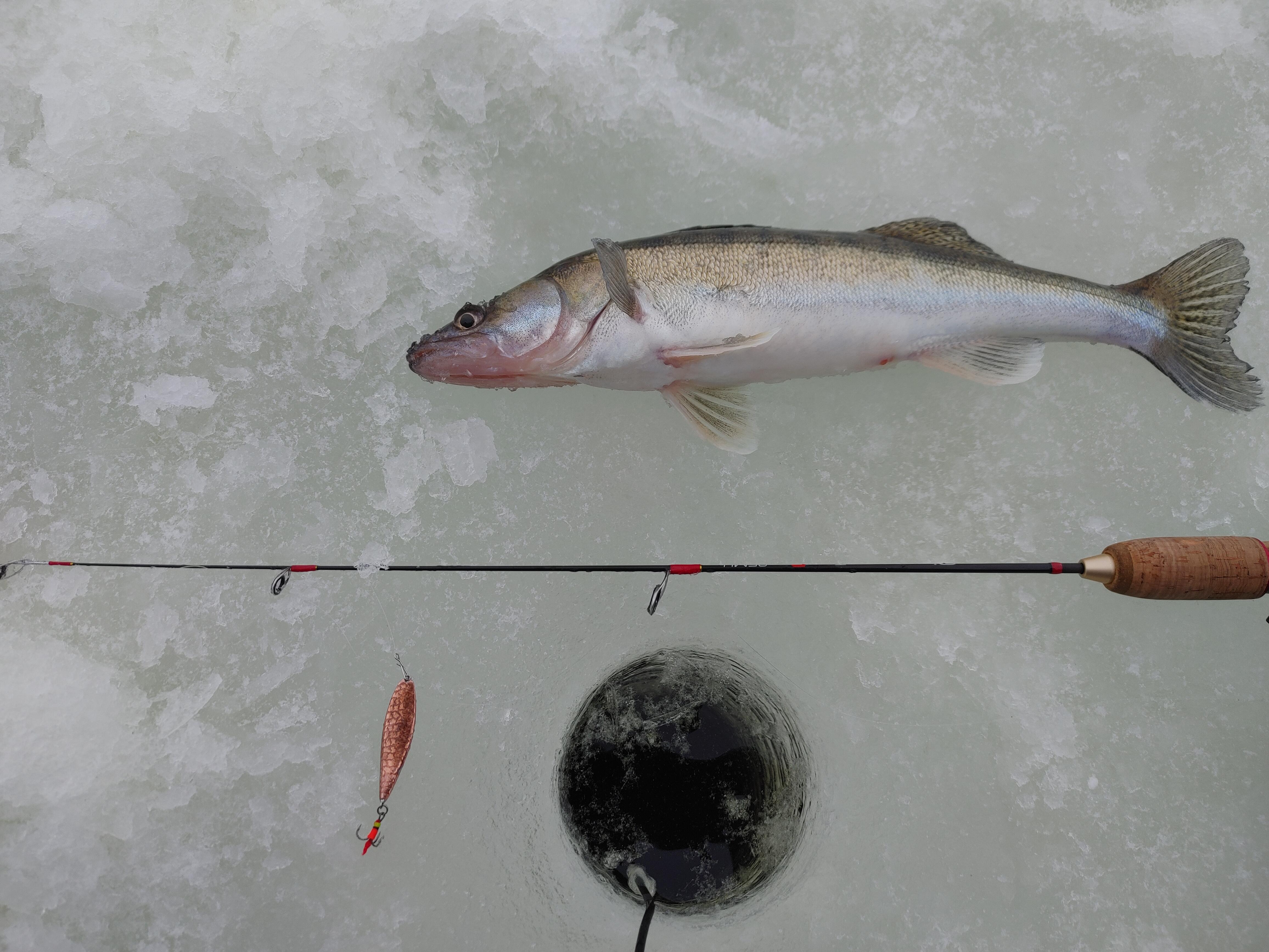Как бонус влетел судачек, аккурат в размер. Первый размерный судак, пойманный мною со льда. Польстился на Валерину Авоську.