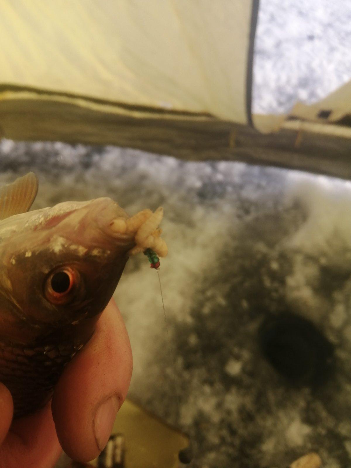 Решил проверить свою догадку и минуты три-четыре безрезультатно играл мормышкой в разных слоях и у самого дна. И как только положил мормышку на дно и сделал паузу в 5-6 секунд — уверенный подъём кивка. Что и следовало доказать. Рыба неактивная, игры не хочет, берёт на стоячку. Но почему то вольфрамку только со дна, а на донку в 15-17 см ото дна. Нижнюю мормышку не трогает. И ещё одна закономерность нарисовалась сразу ( спасибо за это Виктору Королю! ). На чистого опарыша клевало плохо. На мотыля тоже как то галимо, больше его снимала, чем жевала. А вот на бутерброд мотыля с опарышем голосовала всеми своими плавниками и чешуйками. Причём именно в таком варианте: СНАЧАЛА мотыль, ПОТОМ опарыш. Я пробовал и наоборот, но поклёвок сразу становилось меньше.