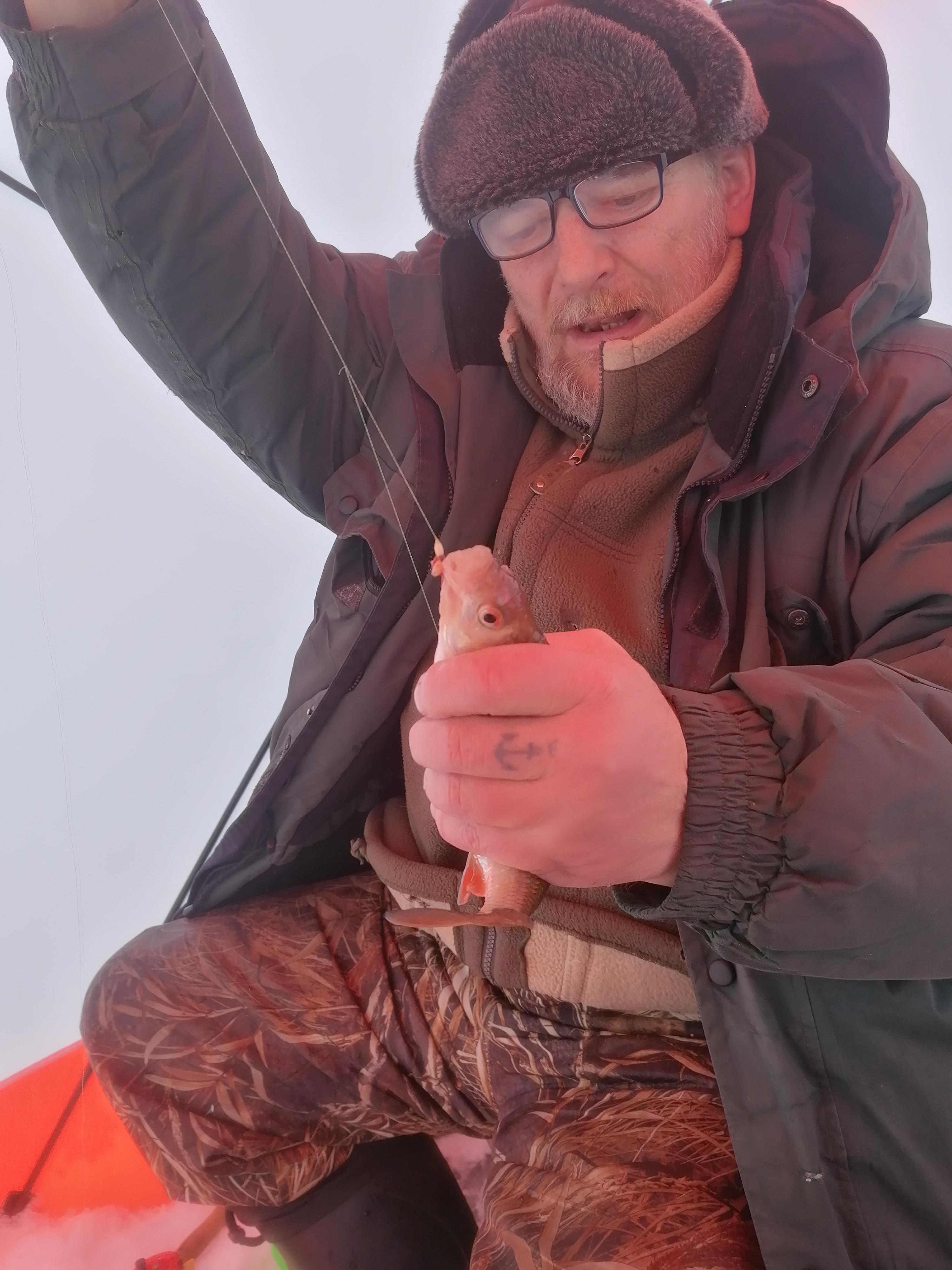 За следующие 7-8 минут я ещё дважды реализовался. Всё на донку и НА ВЕРХНЮЮ (!!) МОРМЫШКУ . Но первые три — это ещё не показатель и я решил проверить «игрульку» — на вторую лунку зарядил балалайку с вольфрамом. К этому времени и Кузьмич обрыбился, но на мой призыв сделать фото пробурчал, что ему ловить надо, а не фотосессиями заниматься. Пока он бурчал я ещё вытащил две — на сковородку уже есть. ))) То есть, приехали не зря.