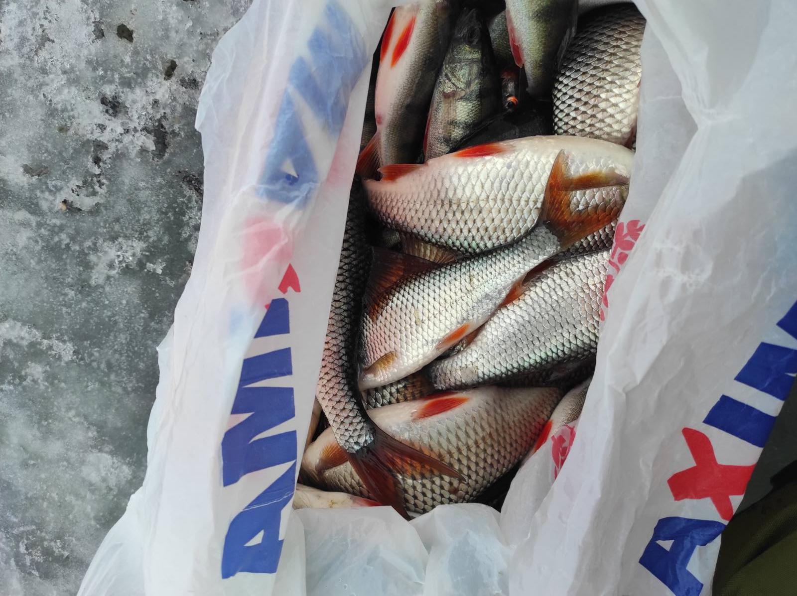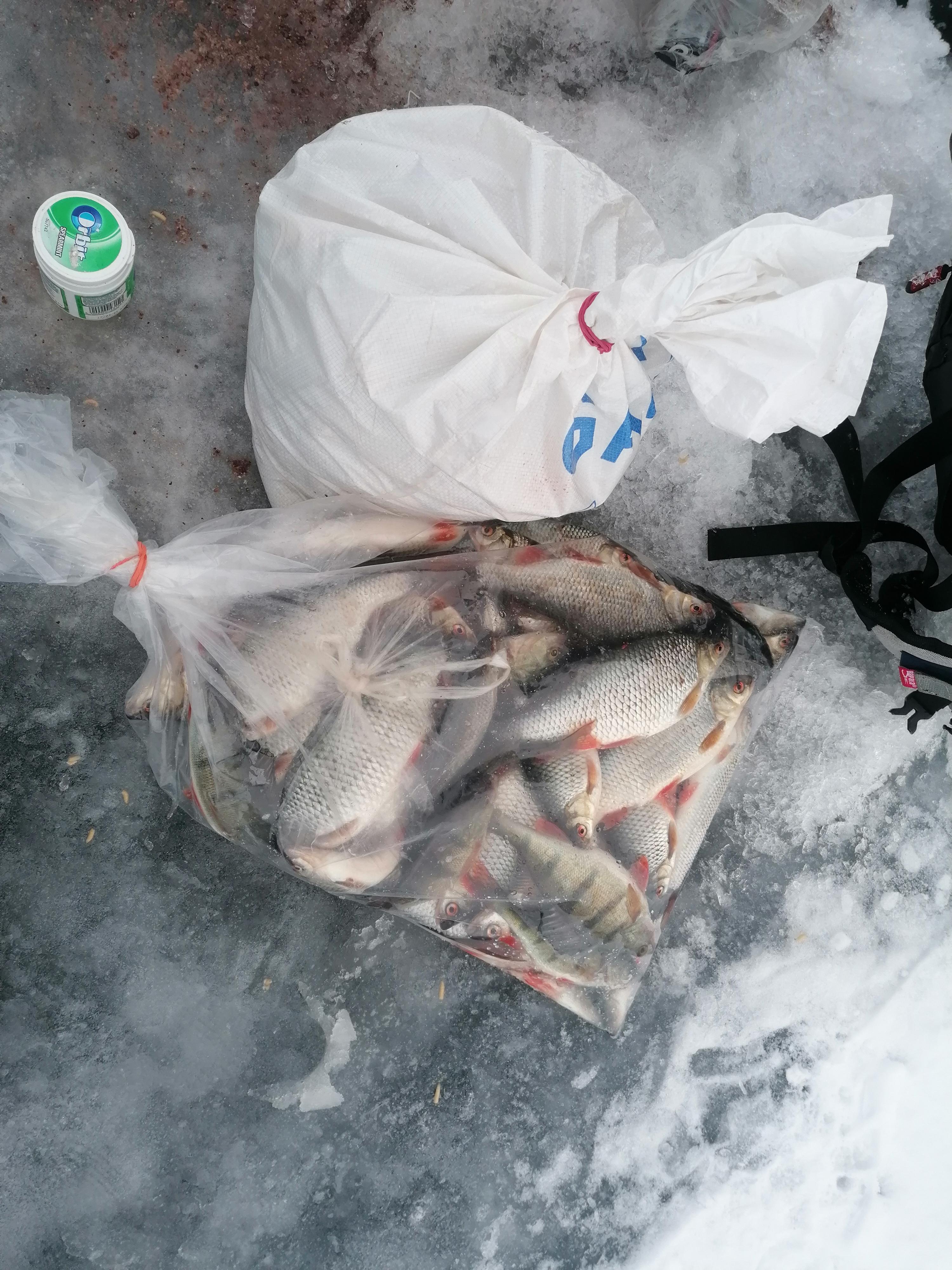 Ну, худо-бедно, мешок я свой заполнил. Не до краёв ,конечно, а до той степени, чтоб можно было резинку на него поставить ( лайфа хака у меня такая ))) У Кузьмича вышло чутка больше. Но так как до берега ещё нужно было дойти, а снег за день подтаял и жутко налипал на санки, я не особо расстраивался. Поймать — это одно. А вот дотащить улов до машины — уже совсем другое.