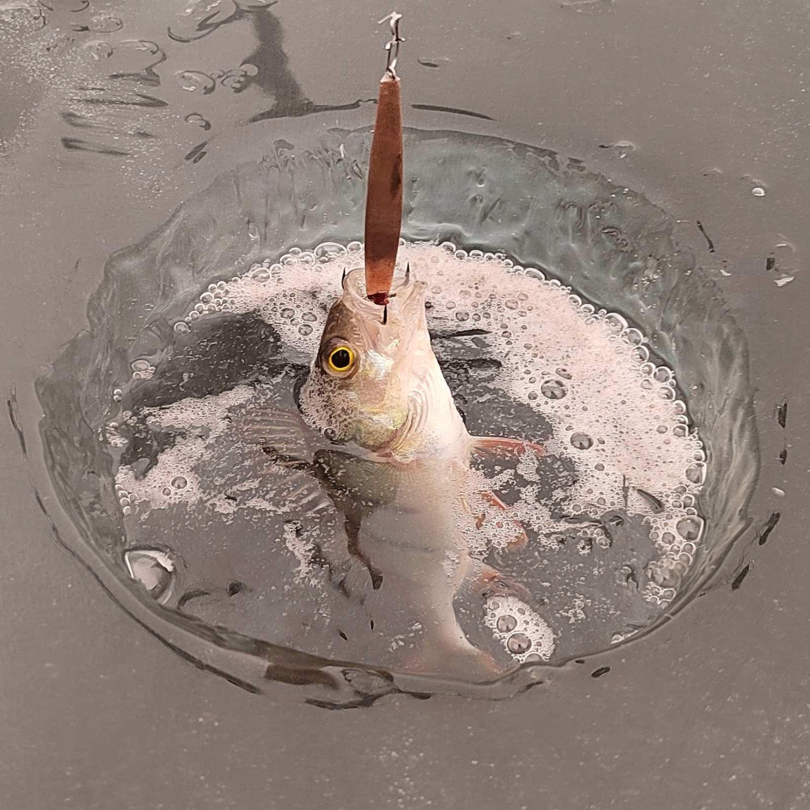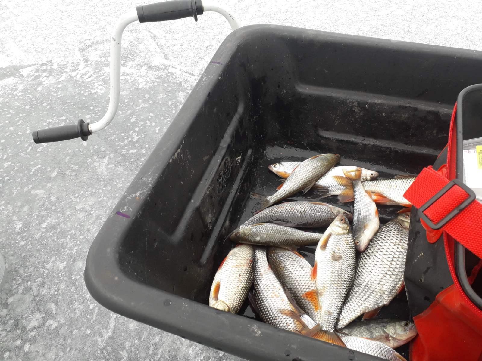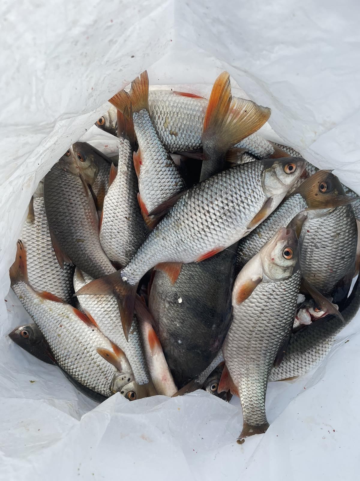 С 7 до половины второго 12-15 плотвиц, в основном живцового размера. Лёд по самый шнек, особо много лунок ручным буром не наделаешь. Kормили, ждали — пусто.