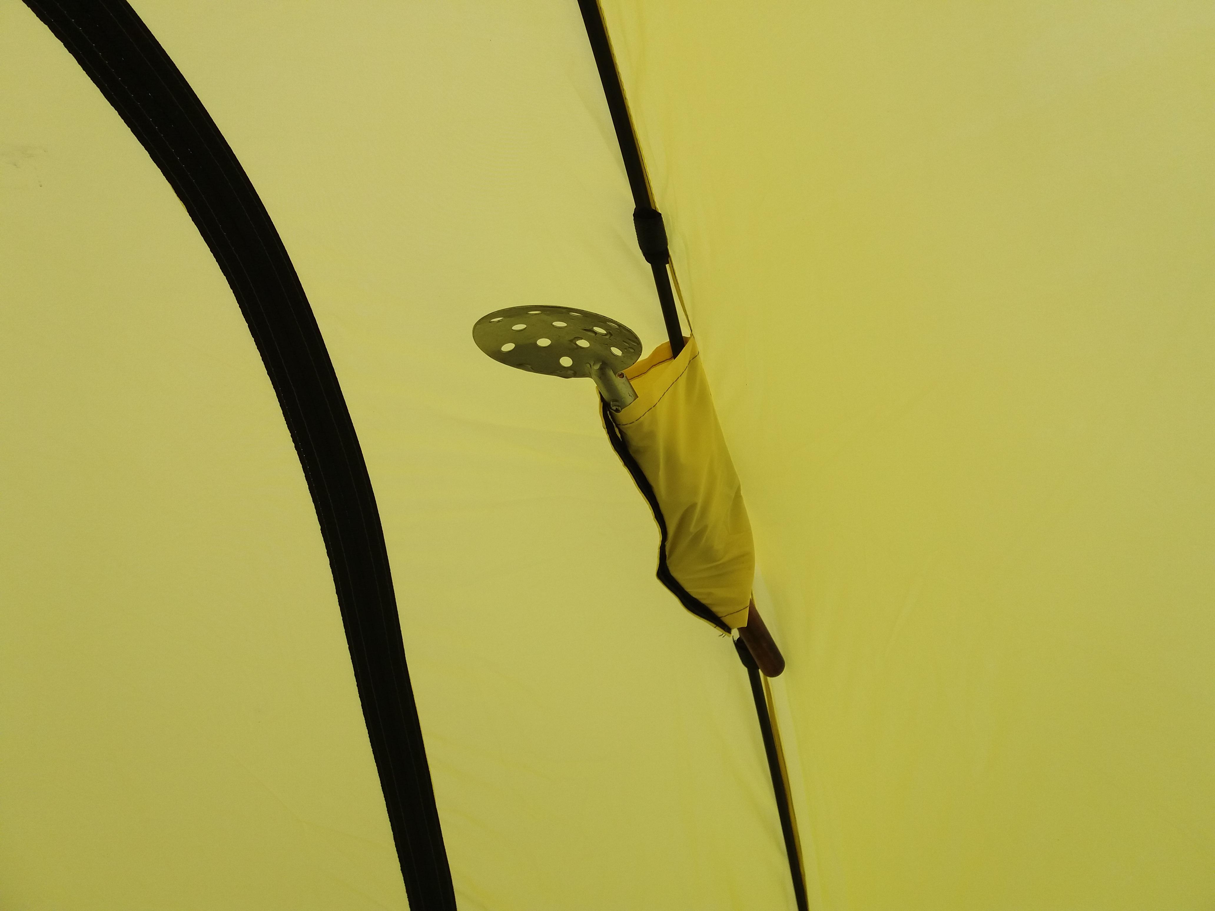 ранее была 180 х 180 см и для меня она несколько тесновата. Я парень не мелкий. А вот 210 х 210 см оказалась, как я и полагал, значительно просторнее. казалось бы, что там 30 см, ан нет — это много! Открывается палатка-зонтик изнутри, удобна в сборе и разборе. Внутри есть места для рыбпричиндалов.
