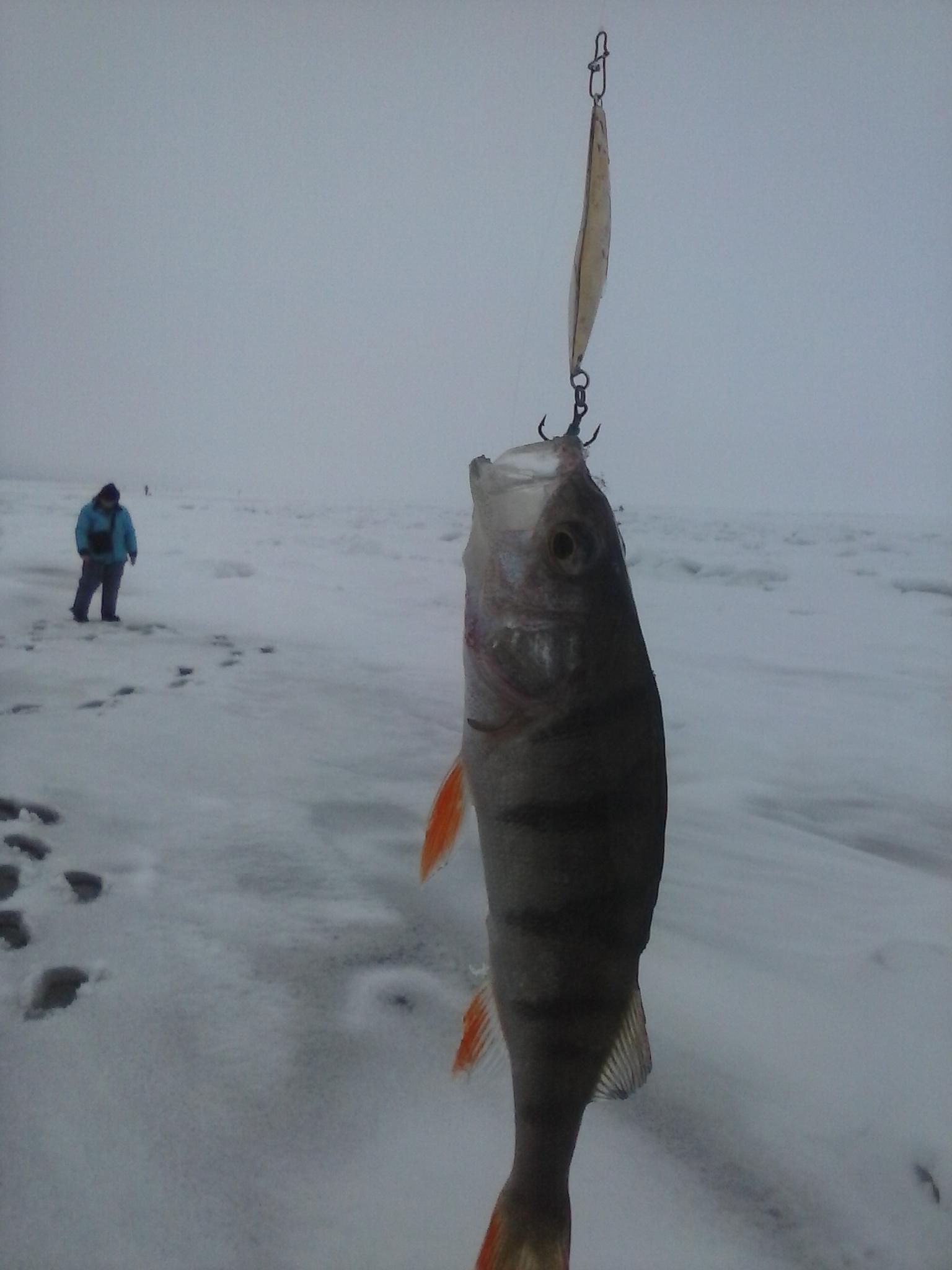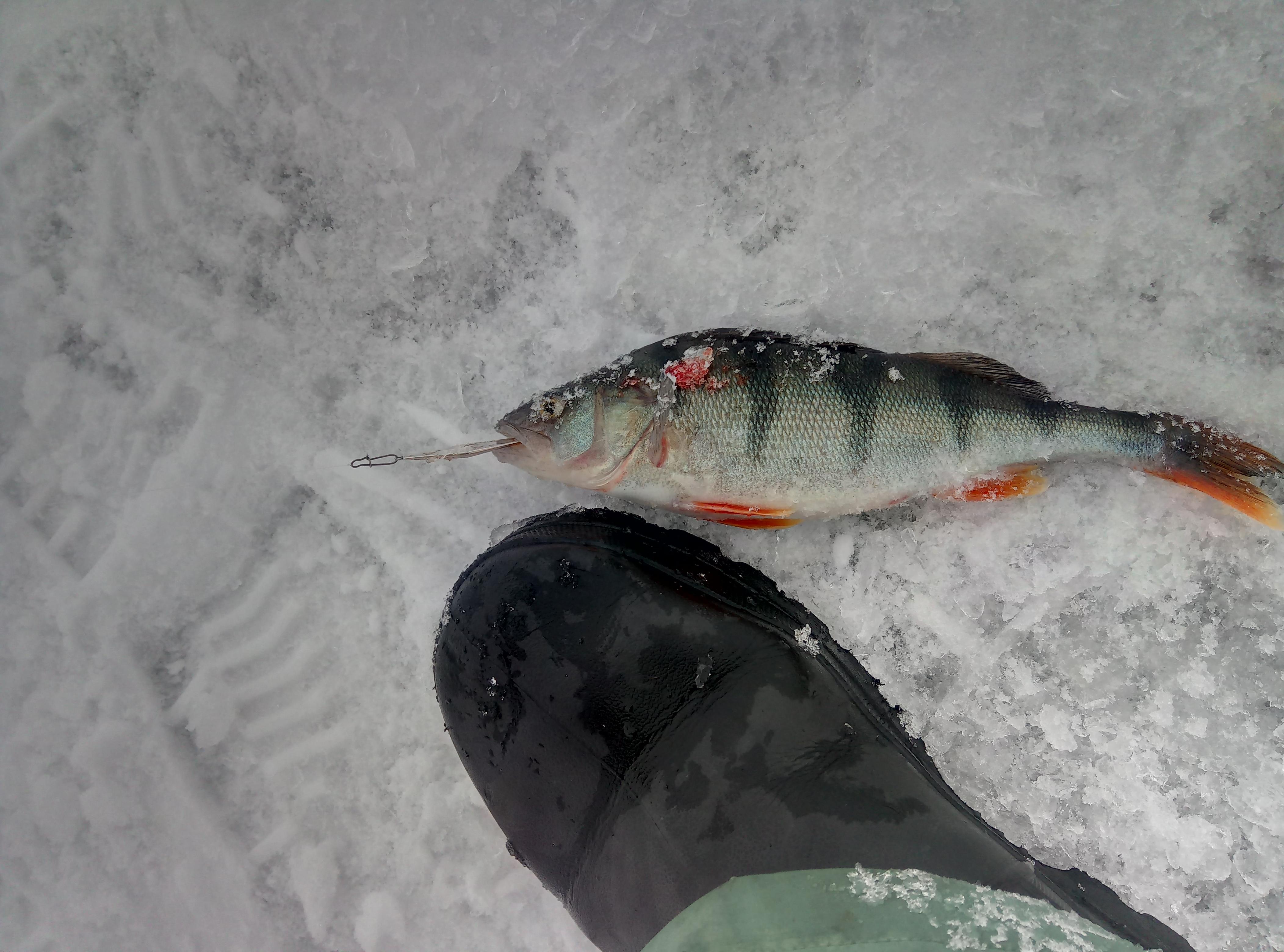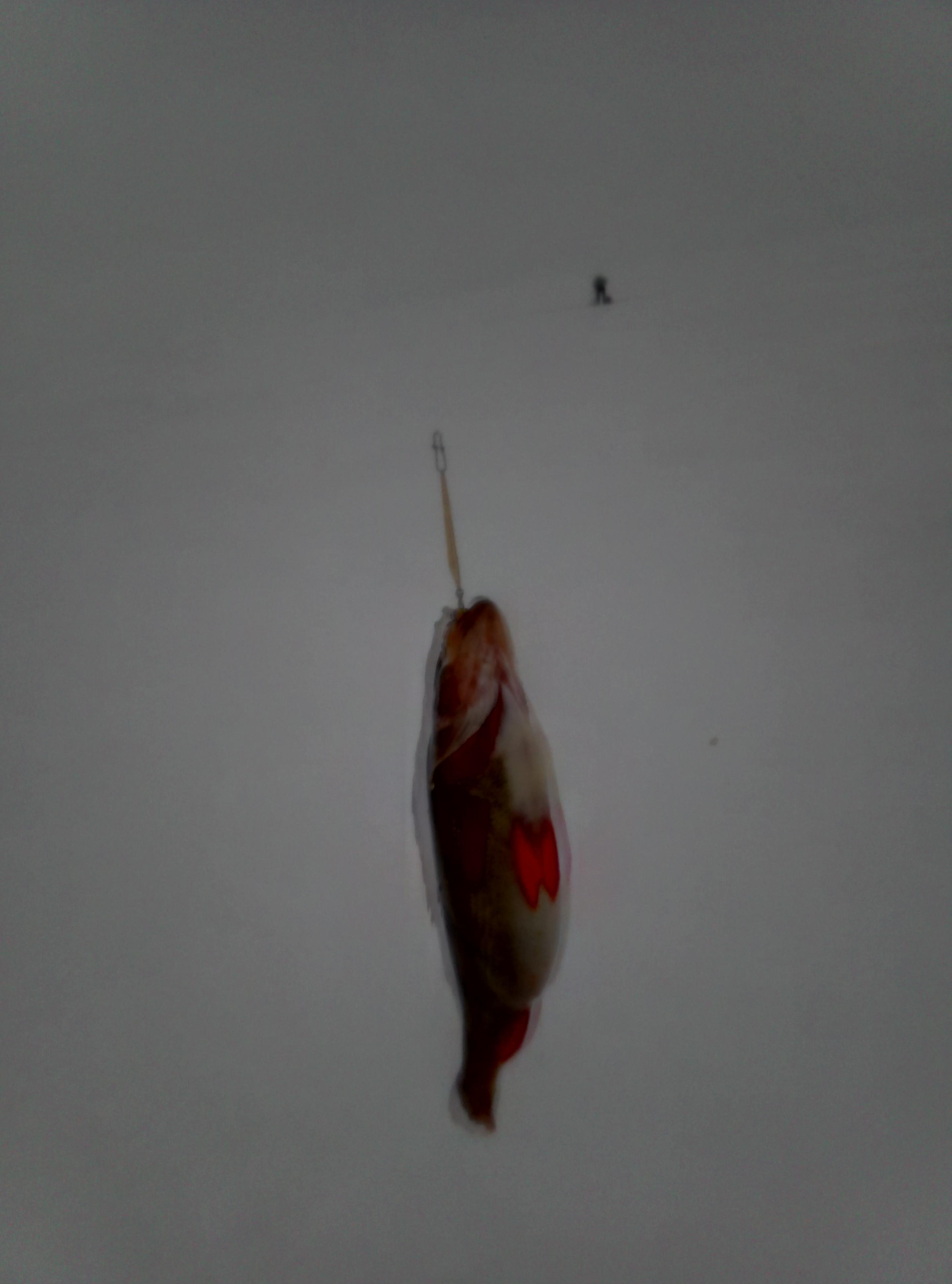 Девять! И это на три км! Ладно, лед держит, надо ловить, но стало весьмаа не комфортно. Начал на Михину трехгранку. Тычки, тычки. Поставил Линдрос с подвесом и вот он, мой первый окунь.