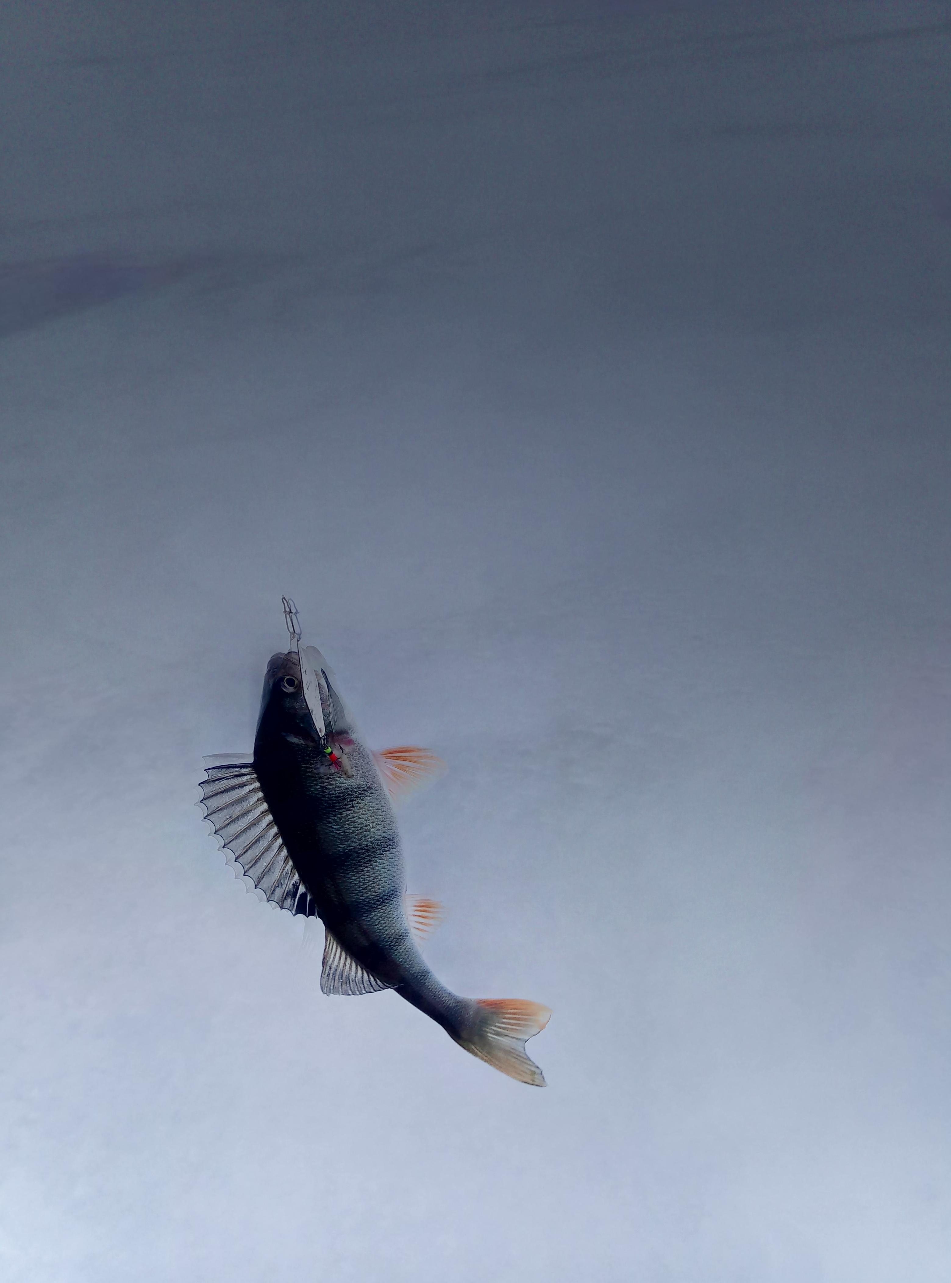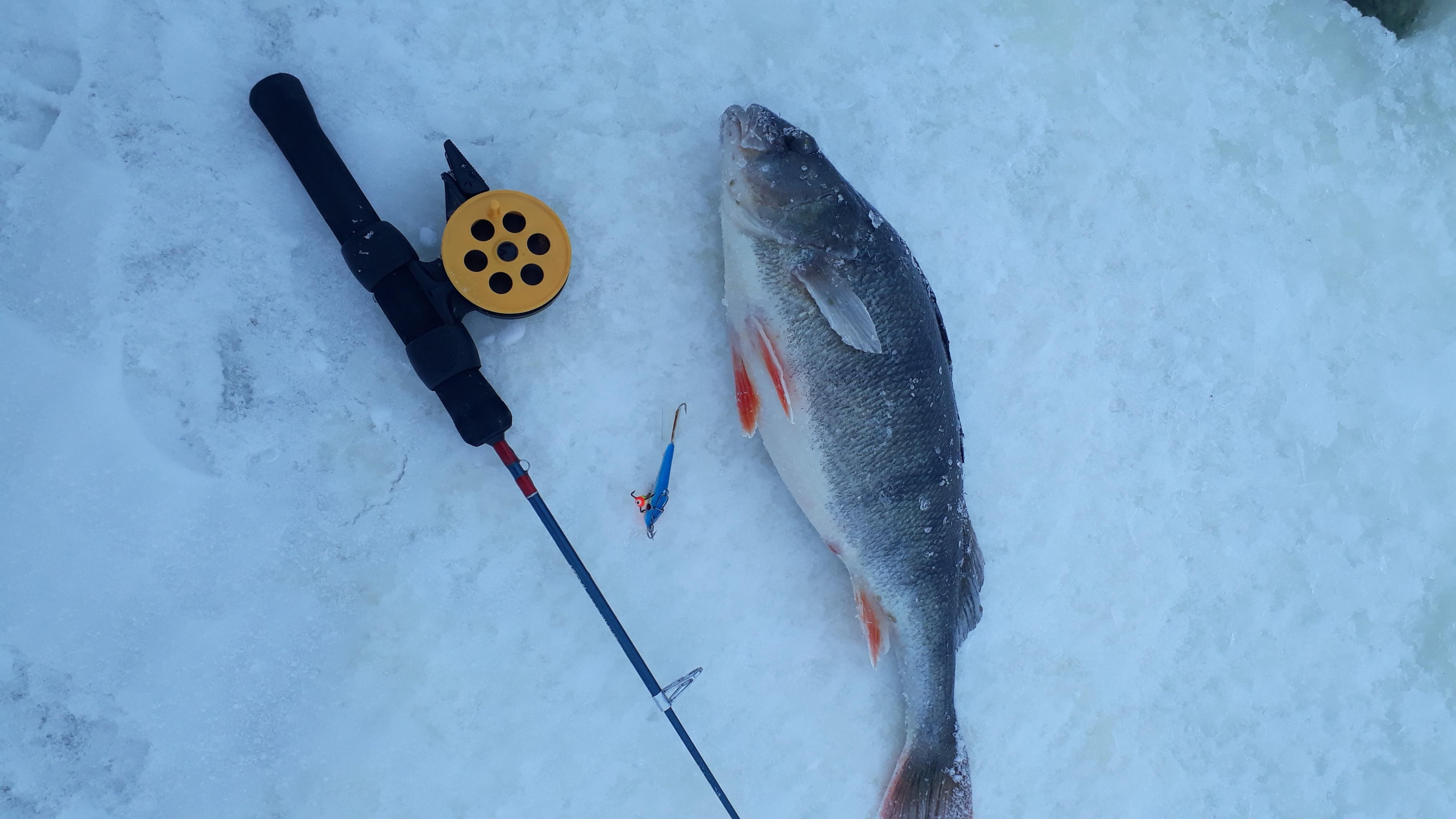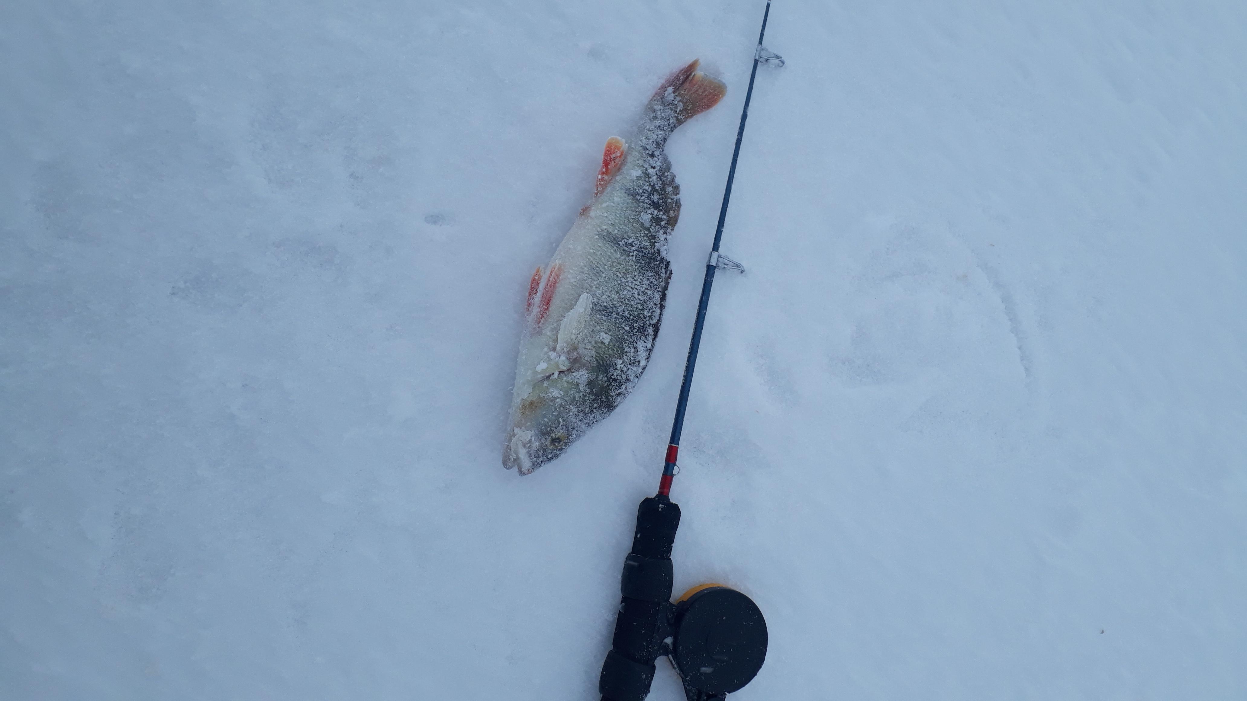 Девять! И это на три км! Ладно, лед держит, надо ловить, но стало весьмаа не комфортно. Начал на Михину трехгранку. Тычки, тычки. Поставил Линдрос с подвесом и вот он, мой первый окунь.