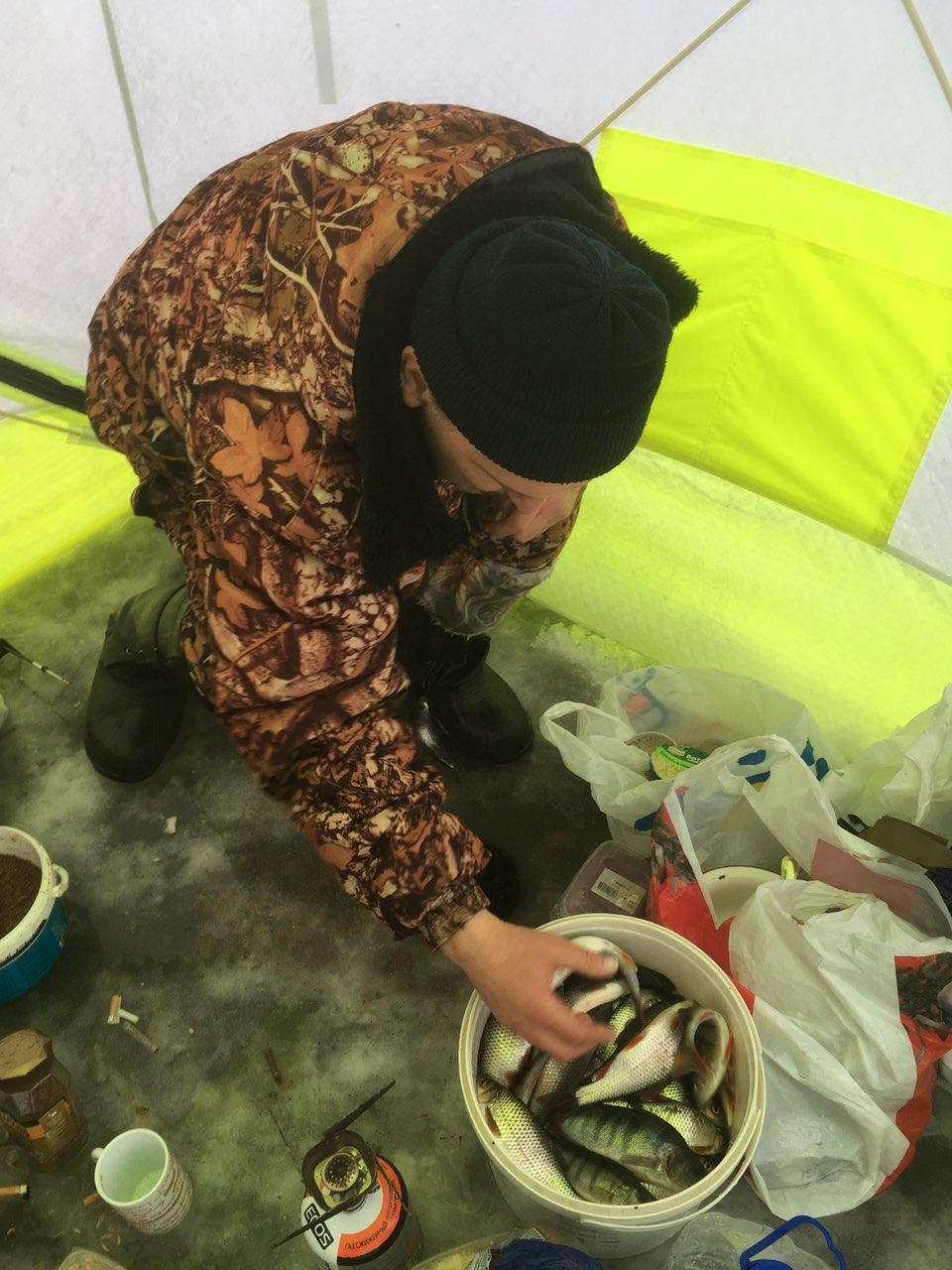 Дамы весь день отсидели на 2.2 км на первых лунках, ловили на мотыля. Окунь, плотва.Ершей не было. Кормили сечкой. У Тани самый крупный окушек — 560 гр.