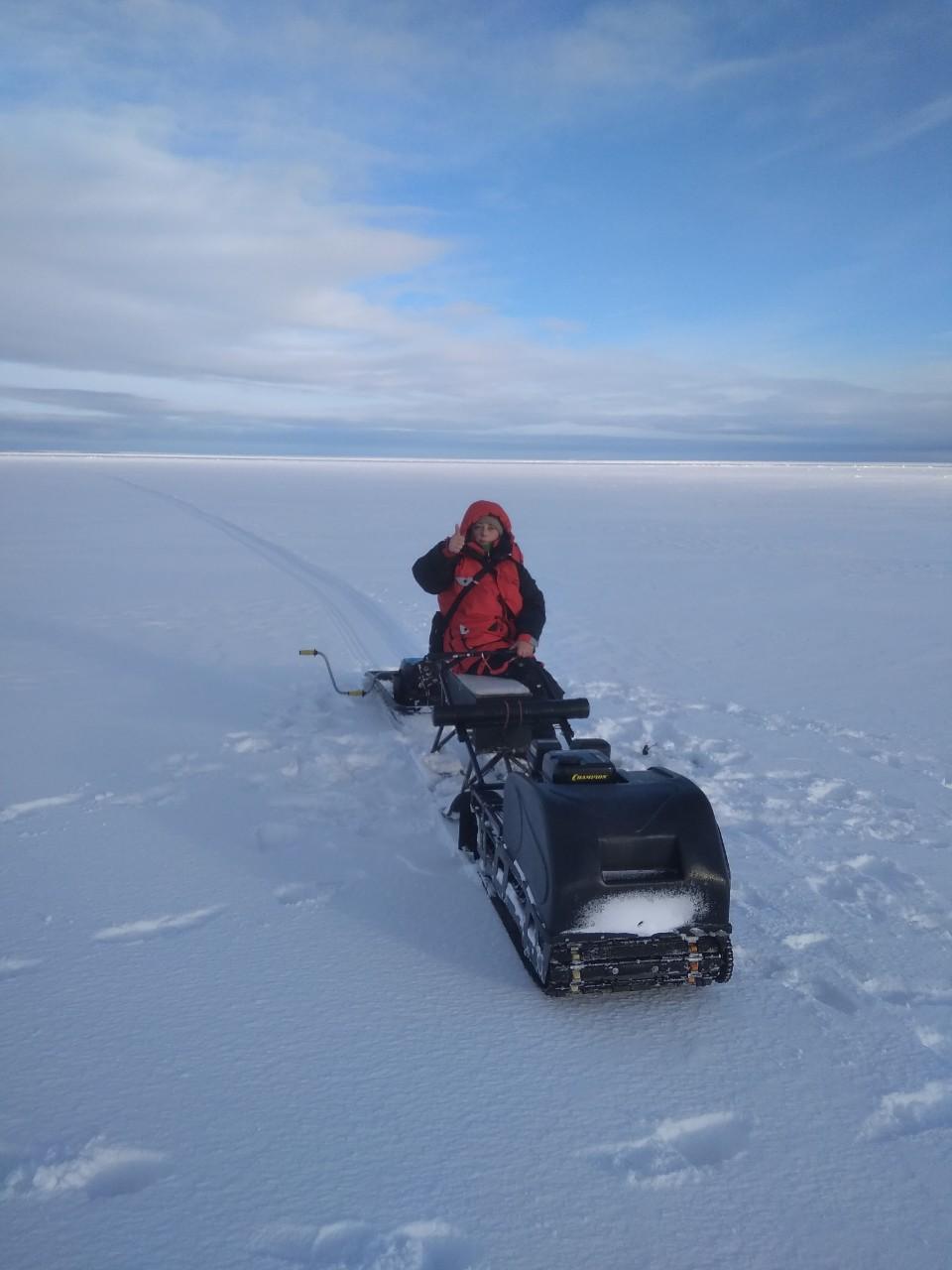 Выходил на буксе из Алаыэ в 7.00. Ход был отличный: до 5км снежное поле скорость 25км/ч, потом чистый лед до самой границы скорость 30-35км/ч. (больше сыкотно) лед весьма не ровный.