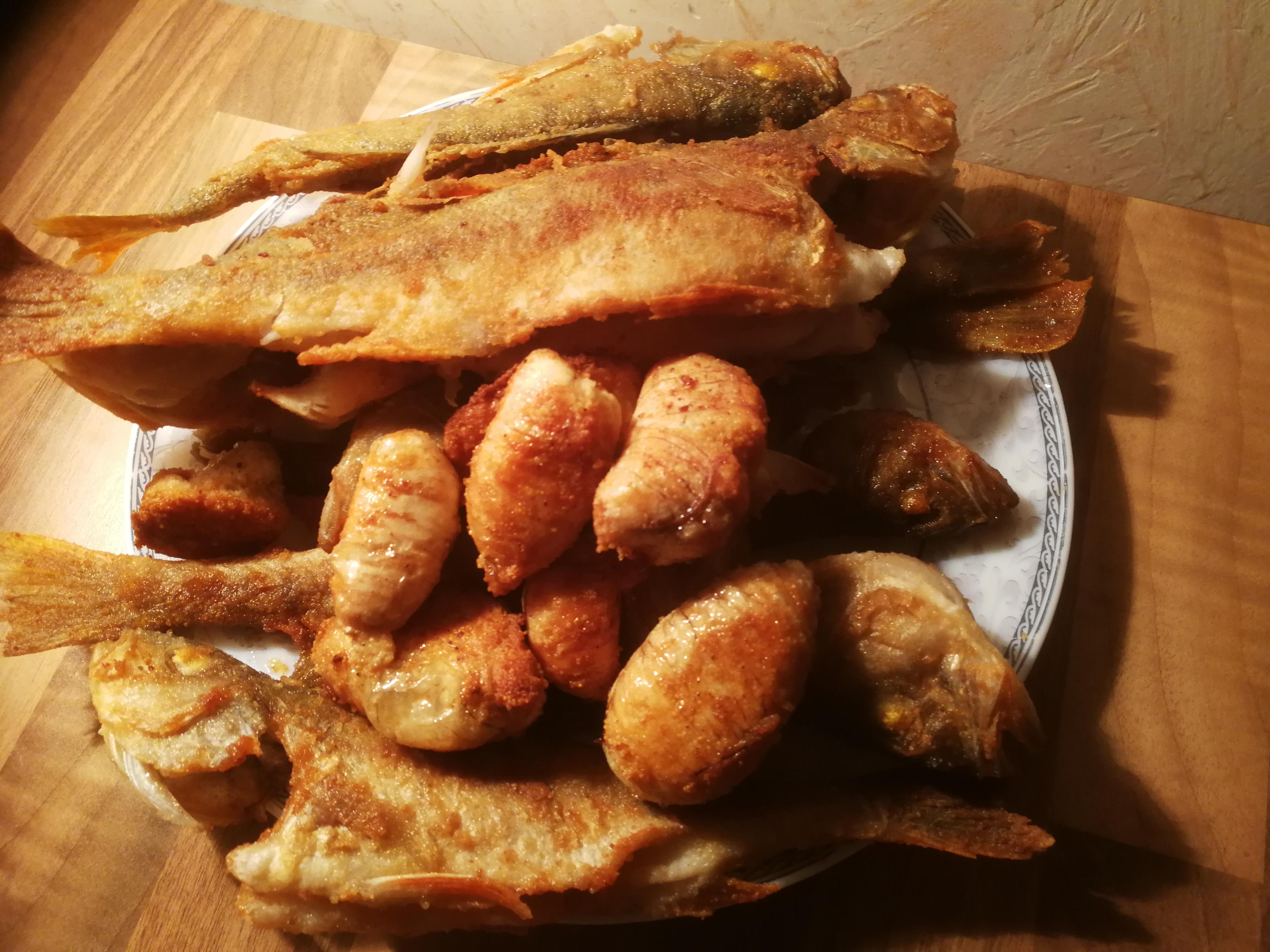 Извиняюсь перед гурманами. Если нравится, то пускай это будет рыбный суп.Ну и конечно рыбка жареная. Мой секрет: 70% муки и 30% панировочных сухарей: