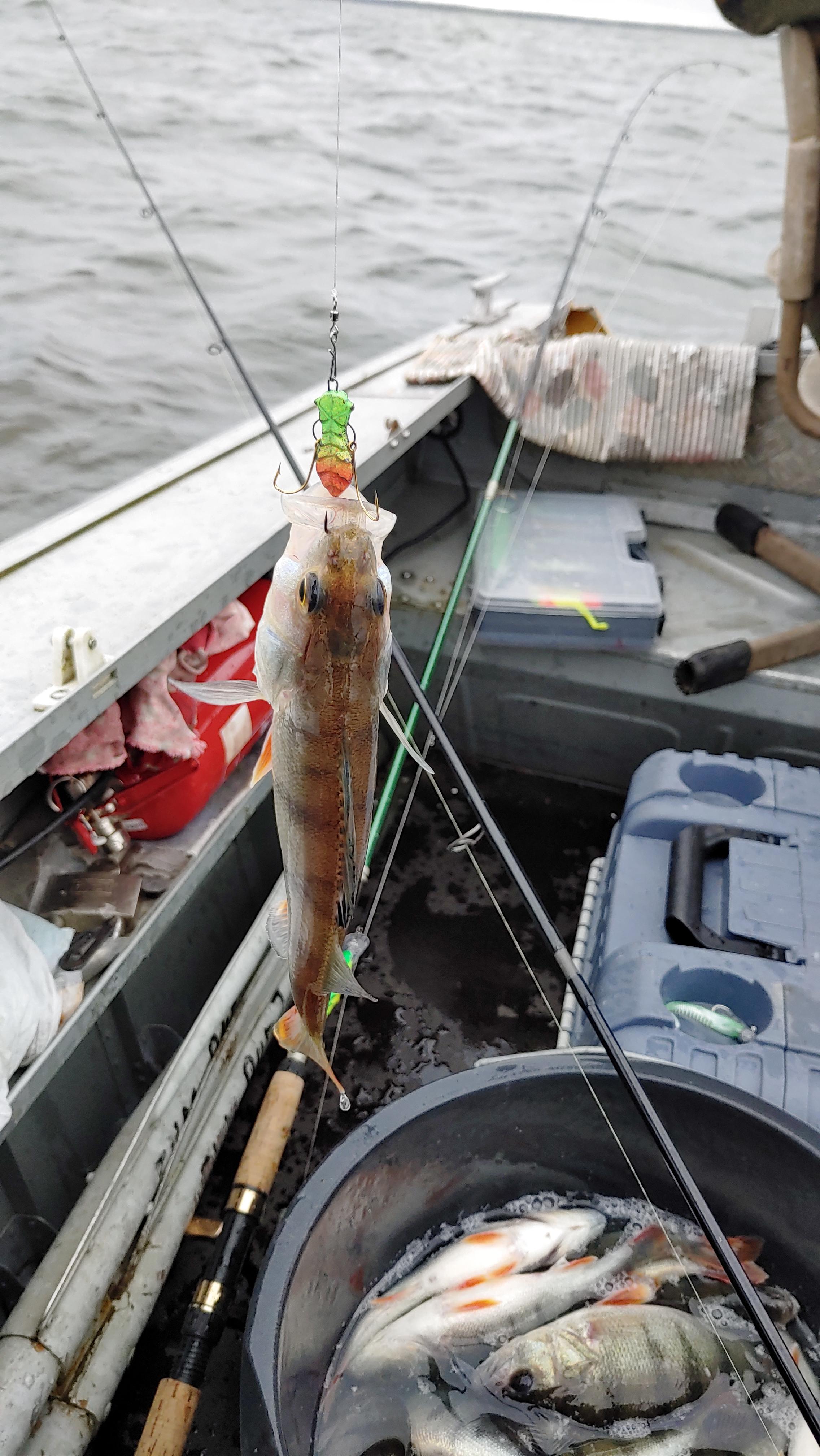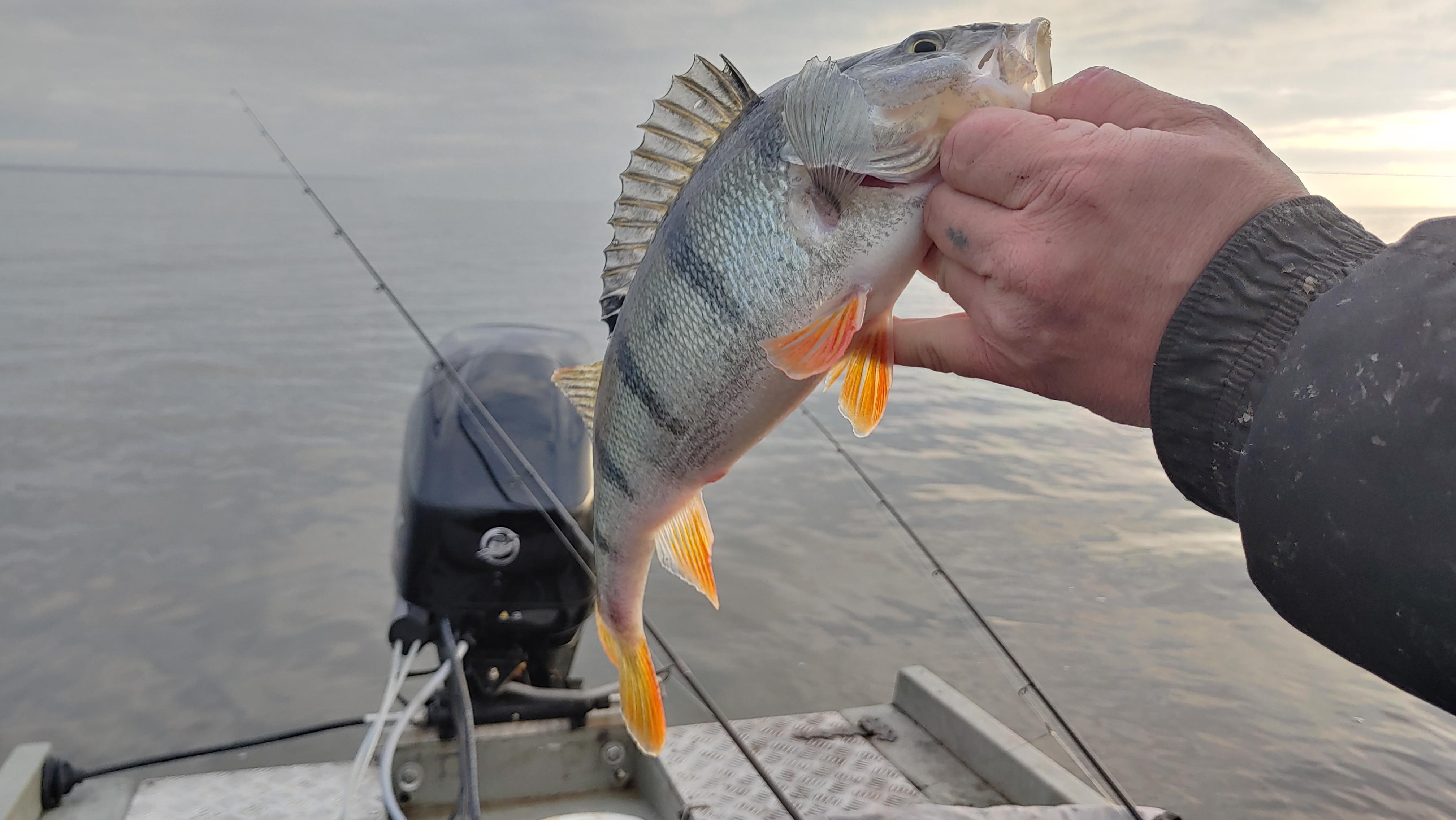 Вчера собрались компанией, и была небыла рванули в озеро. Не пойиать, так хоть на волнах покачаться. В озере качало неслабо, но вообщем то терпимо. 6 км шли почти час Со второй попытки получилось встать на точку и понеслась.. Окунь брал все, что падало в воду. Я поставил шведского жука и ловил в отвес со дна, таскал окуней прямо из под лодки. Размер 100- 250 грамм, процентов 70 летело за борт. В итоге словили и несколько околопоукилограммовиков. Такая рыбалка быстро наскучила и поднабив ноеобходимое количество ушли засветло в берег. Размер конечно расстраивает, с ностальгией вспоминаю летних кабанчиков =)