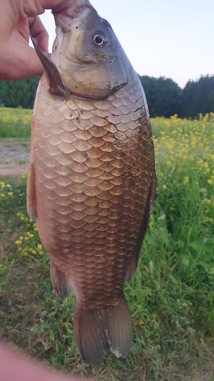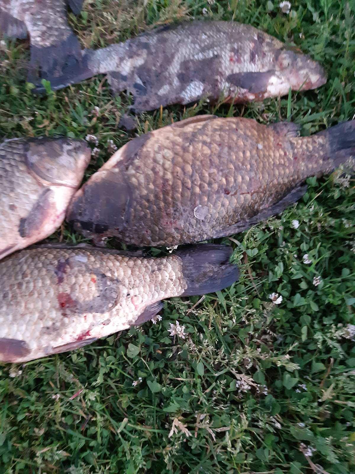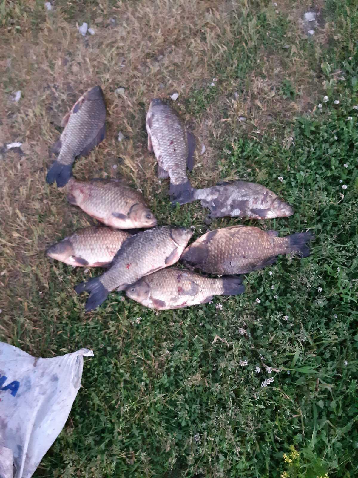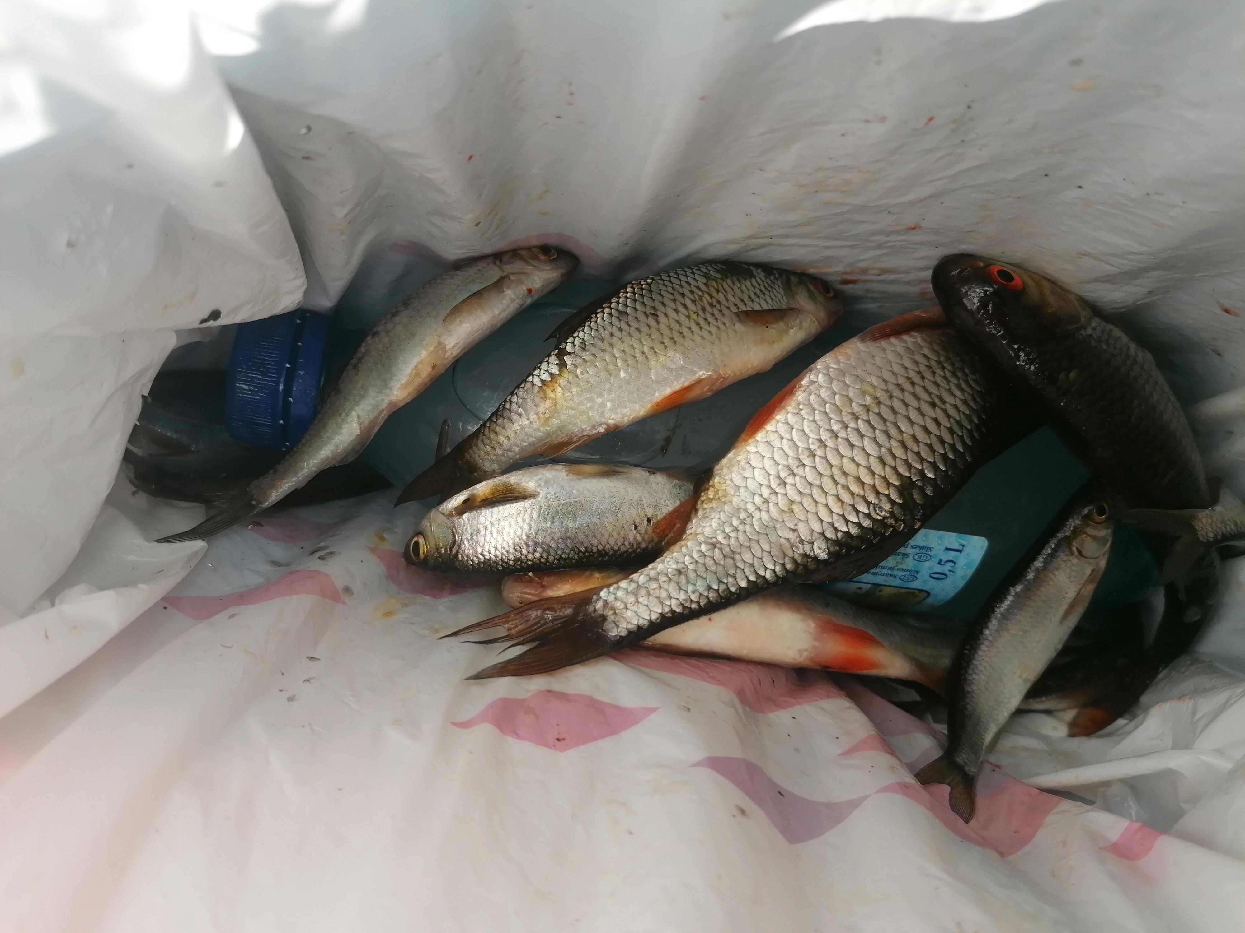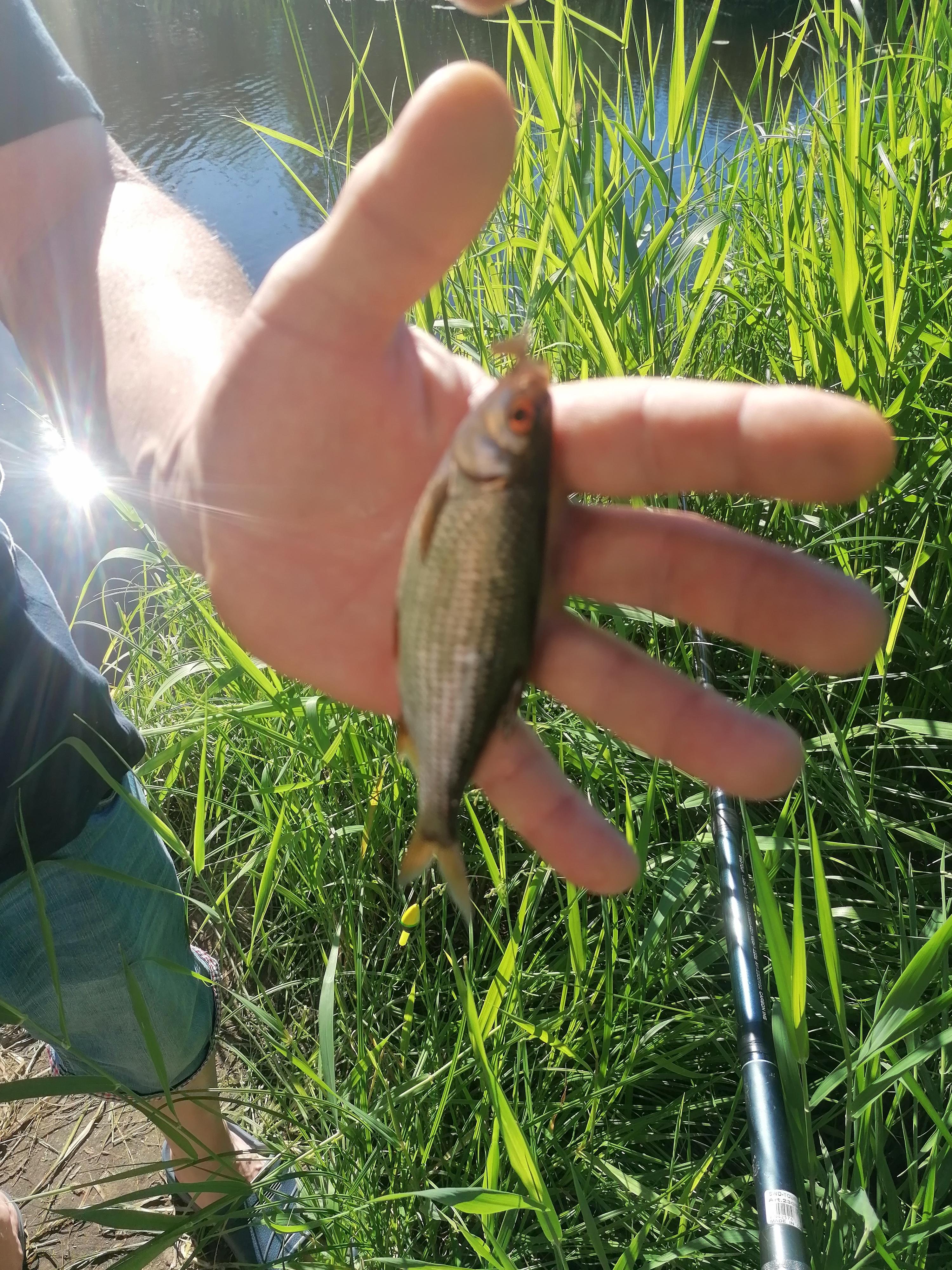 Сидели на речки с 4 часов утра, до 8 часов утра. Пробовали ловить карася на фидер у кувшинок. Но улов не порадовал, поймали только пару уклеек и маленьких окушков. Наше пребывание там все время сопровождалось плесканием рыбы.