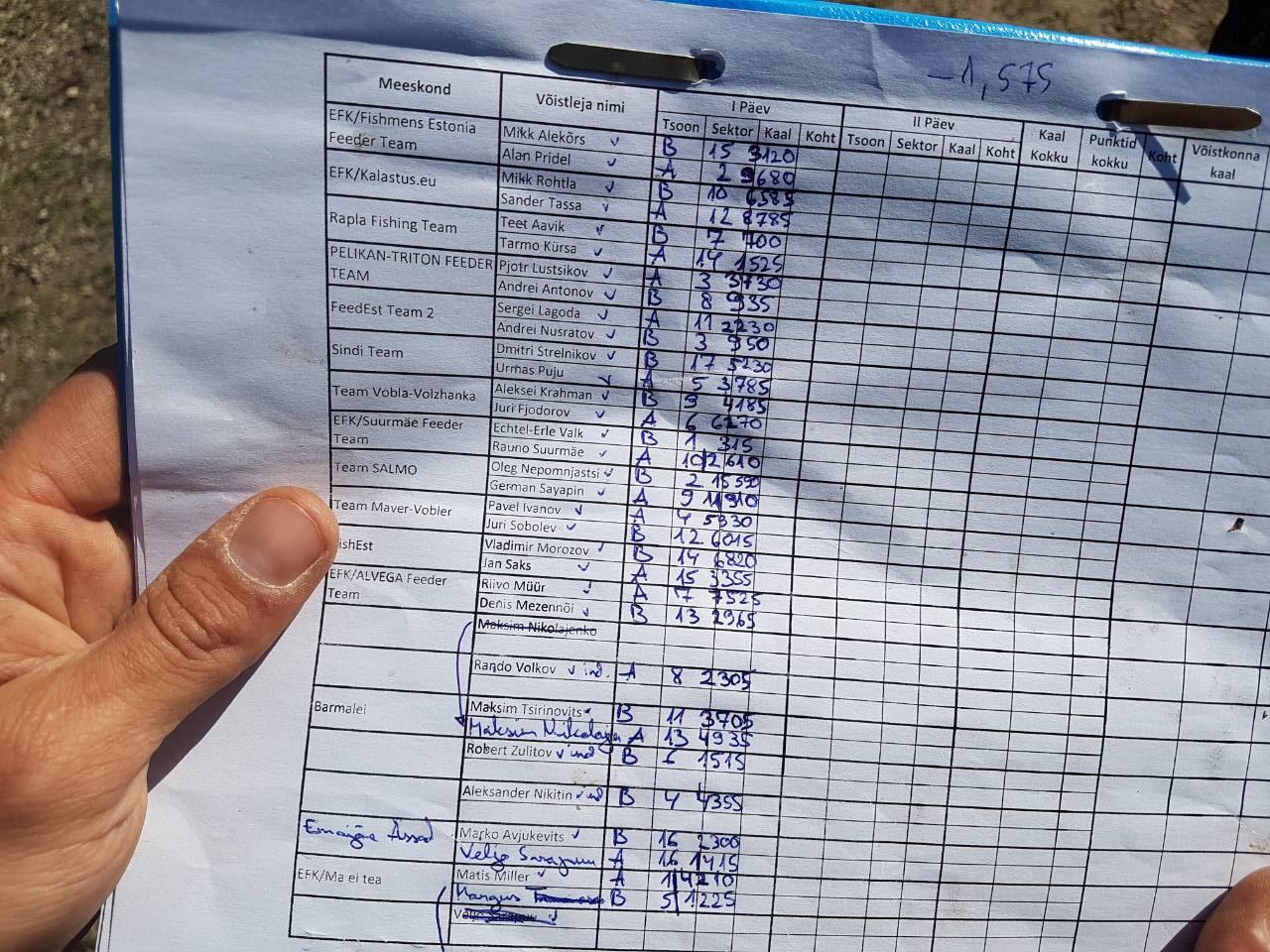 Приехал на место сбора, на старую трассу,примерно за 1,5 часа до жеребьёвки, чтобы замесить прикормку и разобраться с живностью. Вскоре подъехал и Паша. Еще раз обсудили нюансы ловли и пошли на жеребьёвку. Паша мне вытащил новую зону на пирсе, сектор А 13, себе Б 15. В первый день также разыгрывали и зоны на второй день, и во второй день мне предстояло ловить на пирсе, что в целом неплохо. Разделили прикормку, живность и я поехал в зону А. Приехав я был немного в шоке, боковой ветер 15 м/с, в последствии он порывами достигал 20-25 м/с обещал сделать первый тур очень сложным. В таких условиях ловить мне еще не приходилось, но ничего не поделаешь, условия для всех одинаковы. Из прямых конкурентов в моей зоне оказались Юра Фёдоров А11 из команды Vobla, Олег Непомнящий А4 из Salmo и Riivo Müür из Альвеги A3. Контролировать я мог только 4 человек в том числе и Юру. А вот Олег и Рииво были вне зоны видимости и это было не очень хорошо. Решил ловить на двух дистанциях, 29м и 52м , начинаю с 29м если что то пойдёт не по плану 52м, если и там нет, отскок на уклейку. Правда я даже не представлял по началу как можно ловить уклейку в темпе, в такой ветер. Подготовка прошла быстро и вот он старт. Кладу 2 маленькие кормушки на ближняк и 4 средние на дальняк. Старт! Первый заброс и сразу следует поклёвка и густера грамм на 40 в садке и на точку сразу встает уклейка, на что я вообще не расчитывал, никакие манипуляции с утяжелением кормушки и ловлей без корма не помогают, уклейка стоит в дно. Решаю перейти на 52. Там уклейки нет и рыба поклевывает, но ветер усиливается и поклевок почти не видно и к тому же разброс из за ветра около 10м, о том чтобы ловить в точке и намёка нет, пытаюсь ловить на счёт и поначалу это приносит свои плоды. На счёт 40 рыба всегда на крючке. Но тут ветер еще усиливается и начинает выкидывать мой садок с 3 камнями и рыбой с 3х метровой высоты наверх на пирс, пока разбирался с этим садком потерял немного времени. В целом после первого часа всех в зоне видимости облавливал, с Юрой шли ровно, у него темп был выше за счет дистанции, но у меня рыба крупней. Второй час прошел довольно ровно. Так мы и шли с Юрой примерно в одном темпе. Третий час у меня сложился плохо и я начал немного отставать, темп был очень рваный и рыба стала мельчать. На 4ом часу я понимаю,что надо что то предпринять. Иначе все это закончится улётом. Ближайшие 30-40 минут я пытаюсь что то сделать, ухожу на 29м ,там все та же уклейка. Потом я решаю проверить все таки уклейку, но она очень не стабильна. В садке по моим подсчетам чуть за 3 кг. Я чувствовал что проигрываю Юре, но обыгрываю человек пять ближайших ко мне, но я понятия не имел что происходит в другом конце трассы. Но тут при очередном забросе в попытке поймать уклейку, я что то замешкался и кормушка упала на дно и последовала поклёвка, подсекаю а на том конце совсем не уклейка, а густера. И тут я понял густера стоит на самом ближняке. Быстро кидаю уклеечную палку. Беру с нормальной оснасткой 10 футовый пикер, отмеряю дистанцию на угад, потом я померил ее на кольях, оказалась 9,5 м . С учетом высоты пирса и глубины, ловил я где то в 4 метрах от пирса.Смотрю на часы 1 час 10 минут до конца тура. Сначала рыбу пришлось раскачивать. Но потом она плотно встала на точку и за оставшееся время я доловил 2кг с хвостиком. Эх пораньше бы это все прочухать, но время ушло.