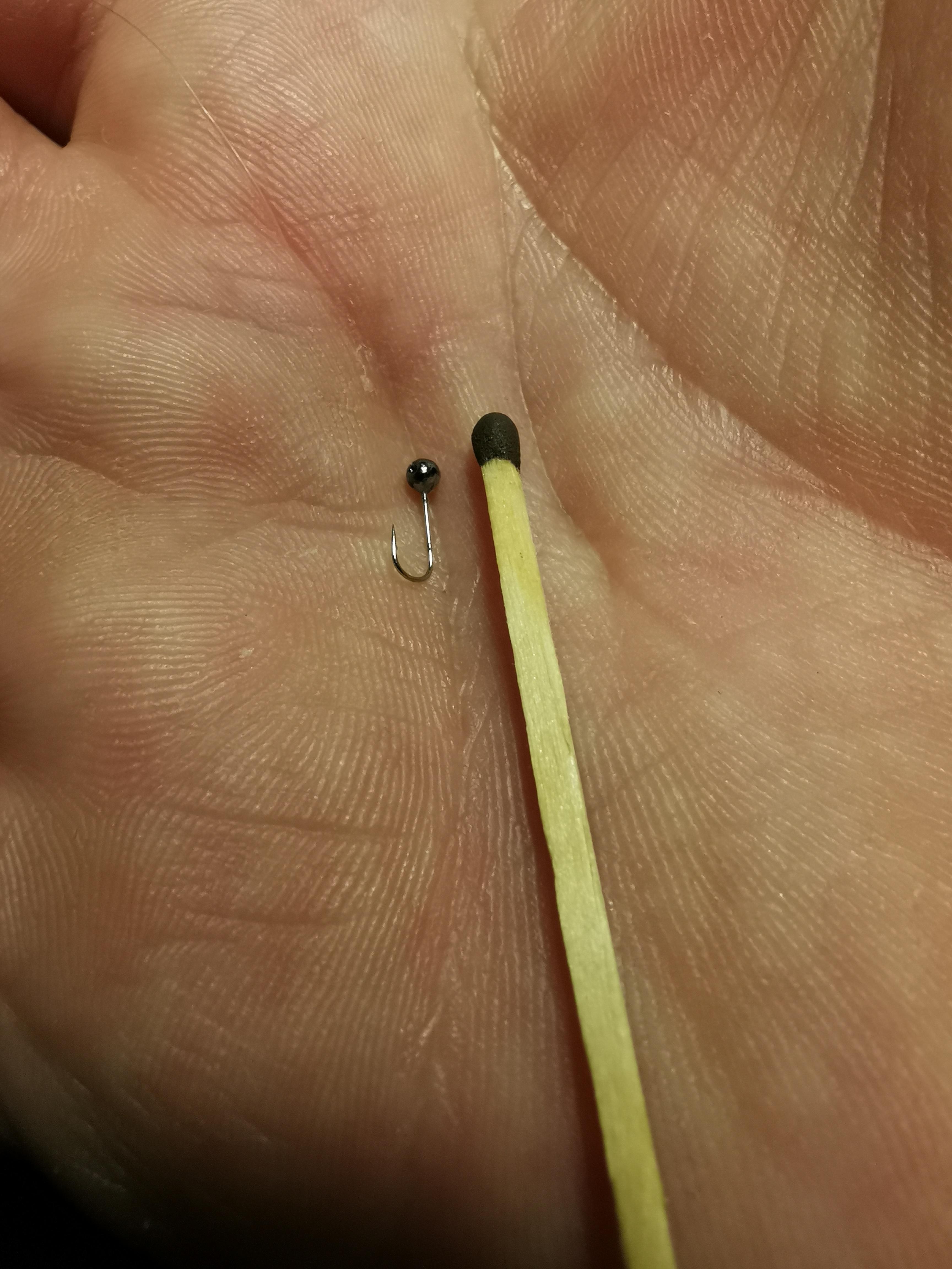 Большая мормышка весит почти 5 гр. !!! Это она на руке так смотрится, а на самом деле просто убойная! Ну, представляешь себе шарик-грузило в 5гр. ??